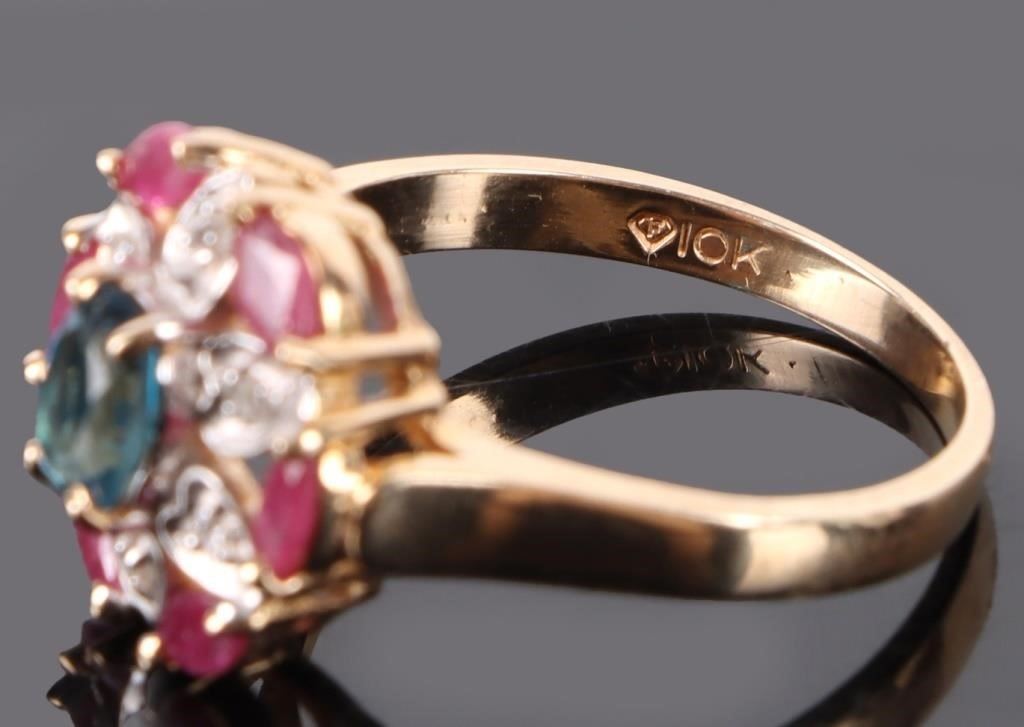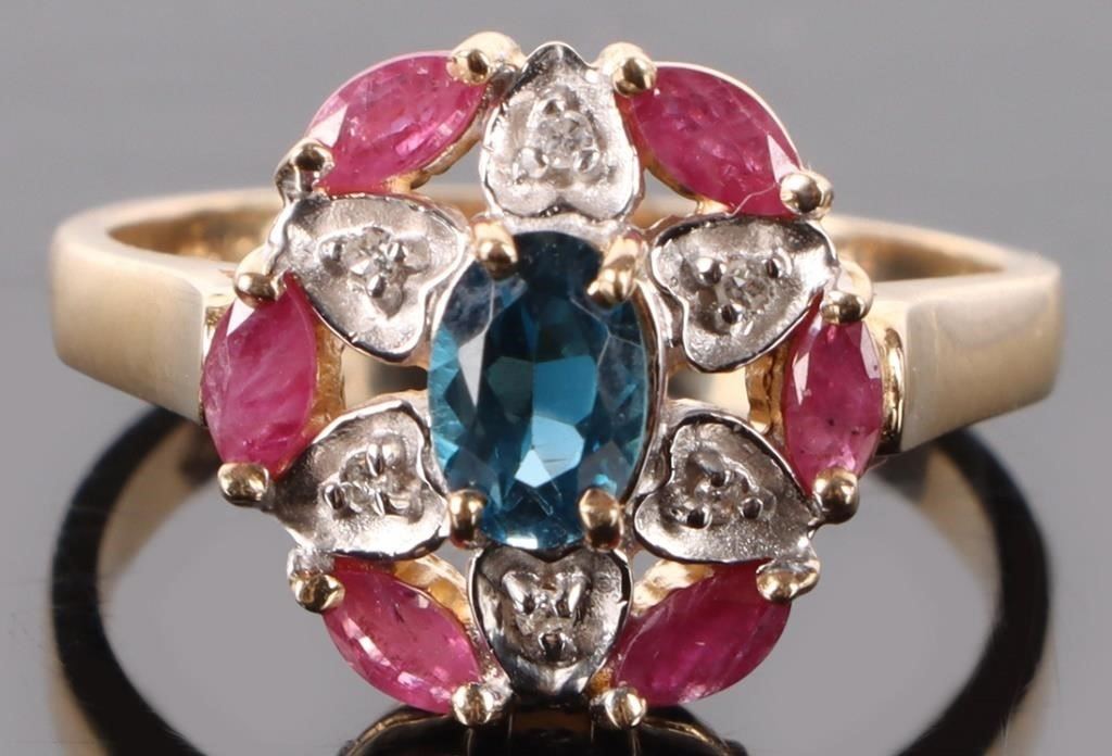 10K RUBY, TOPAZ & DIAMOND CLUSTER RING