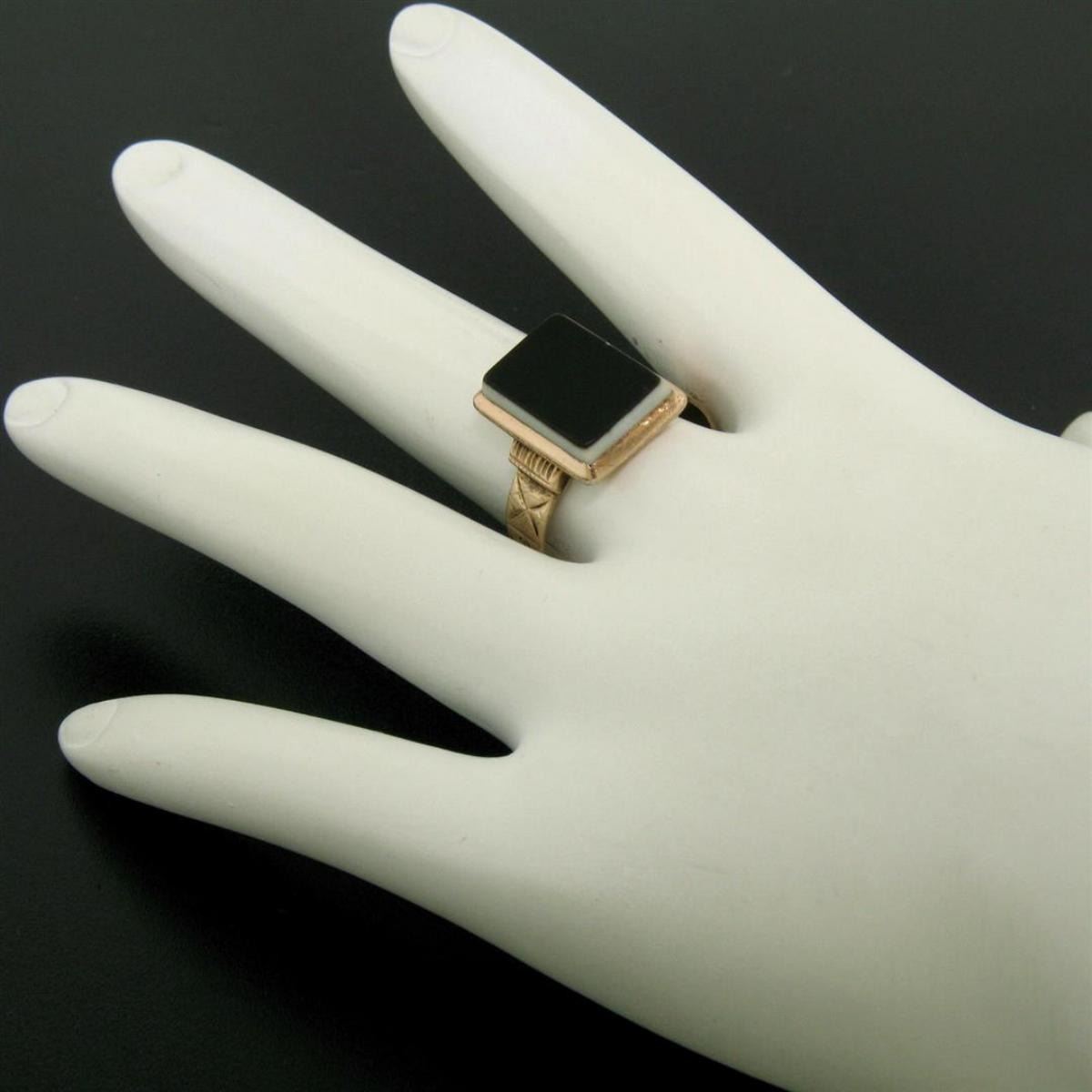 One Antique Victorian Etched 10K Rose Gold Bezel Set Uncarved Stone Solitaire Ring. Item Details: Material: 10K Solid Rose Gold, Weight: 3.8 Grams, Stone(s): (1) Natural Un-Carved Black and White Stone - Rectangular Shape - Bezel Set - 13x9mm (approx.), Ring Size: 8.5 (We can custom size this ring.), Ring Width: 15.2mm, Ring Height: 4.3mm rise off the finger, Condition: Antique ring, excellent condition with all original patina. Can be polished to like new if desired.