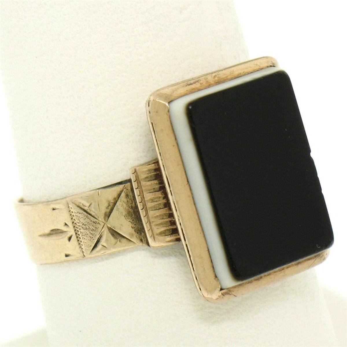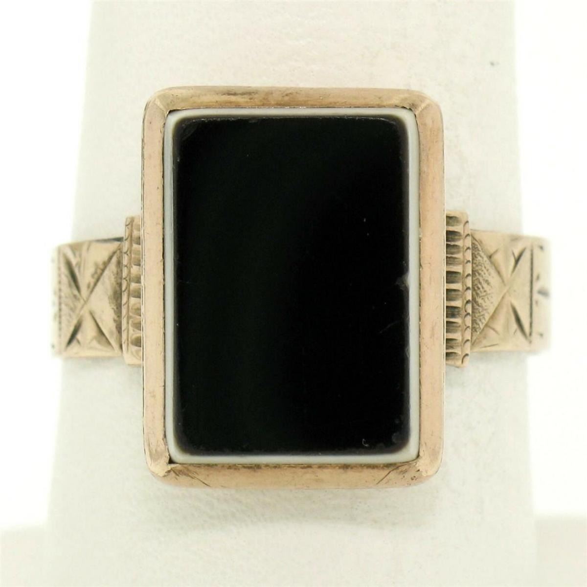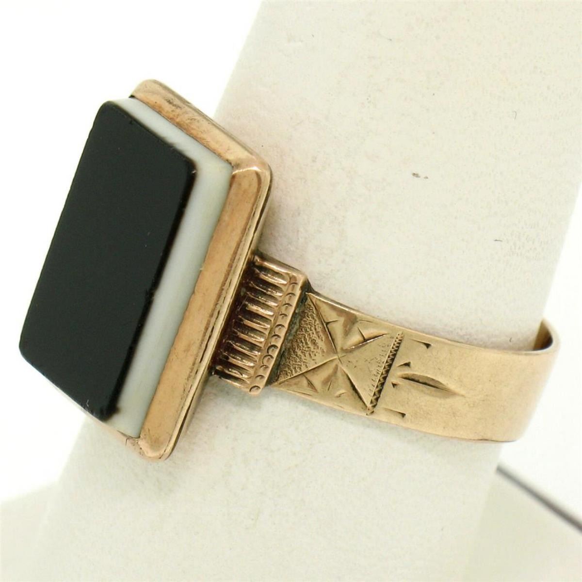 One Antique Victorian Etched 10K Rose Gold Bezel Set Uncarved Stone Solitaire Ring. Item Details: Material: 10K Solid Rose Gold, Weight: 3.8 Grams, Stone(s): (1) Natural Un-Carved Black and White Stone - Rectangular Shape - Bezel Set - 13x9mm (approx.), Ring Size: 8.5 (We can custom size this ring.), Ring Width: 15.2mm, Ring Height: 4.3mm rise off the finger, Condition: Antique ring, excellent condition with all original patina. Can be polished to like new if desired.