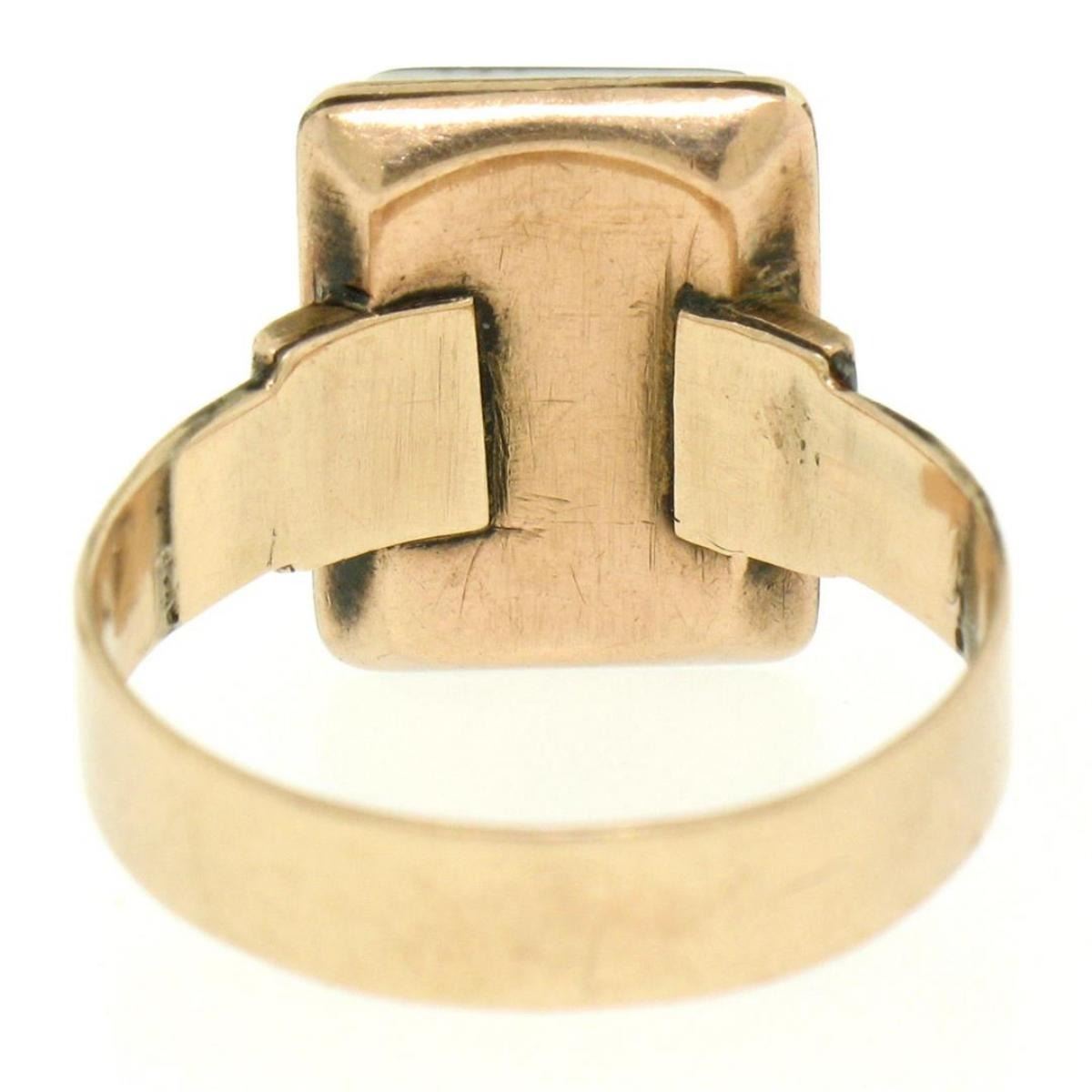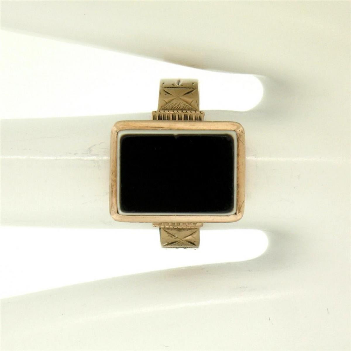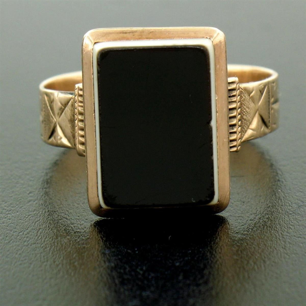 One Antique Victorian Etched 10K Rose Gold Bezel Set Uncarved Stone Solitaire Ring. Item Details: Material: 10K Solid Rose Gold, Weight: 3.8 Grams, Stone(s): (1) Natural Un-Carved Black and White Stone - Rectangular Shape - Bezel Set - 13x9mm (approx.), Ring Size: 8.5 (We can custom size this ring.), Ring Width: 15.2mm, Ring Height: 4.3mm rise off the finger, Condition: Antique ring, excellent condition with all original patina. Can be polished to like new if desired.