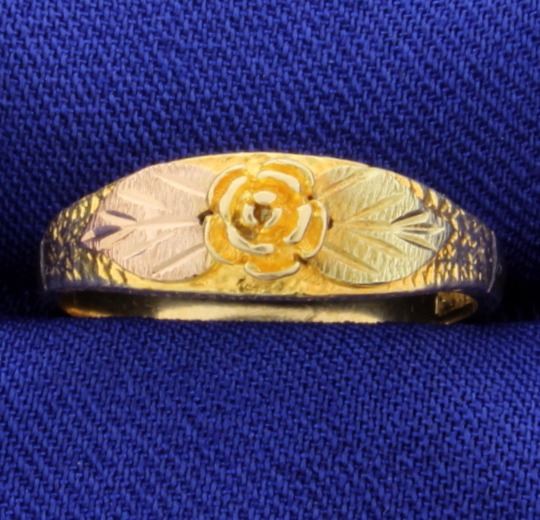 10K yellow, rose & green gold, it has great detail! Size 7 1/2 2.6g