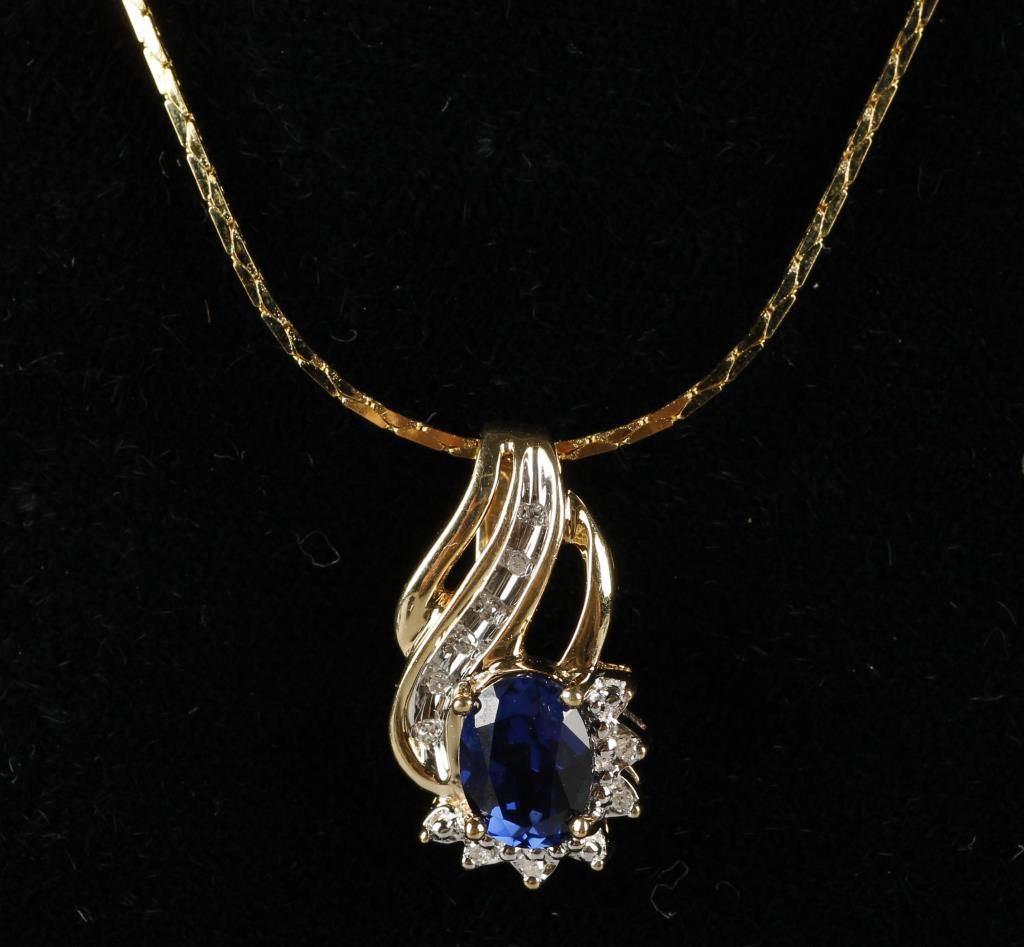 Stunning 10K sapphire & diamond pendant on an 18" chain. The luscious blue sapphire is about 1.5 carats and is accented with small diamonds. The chain is 18" long and is 14K gold over sterling silver. You will definitely get noticed wearing this necklace.