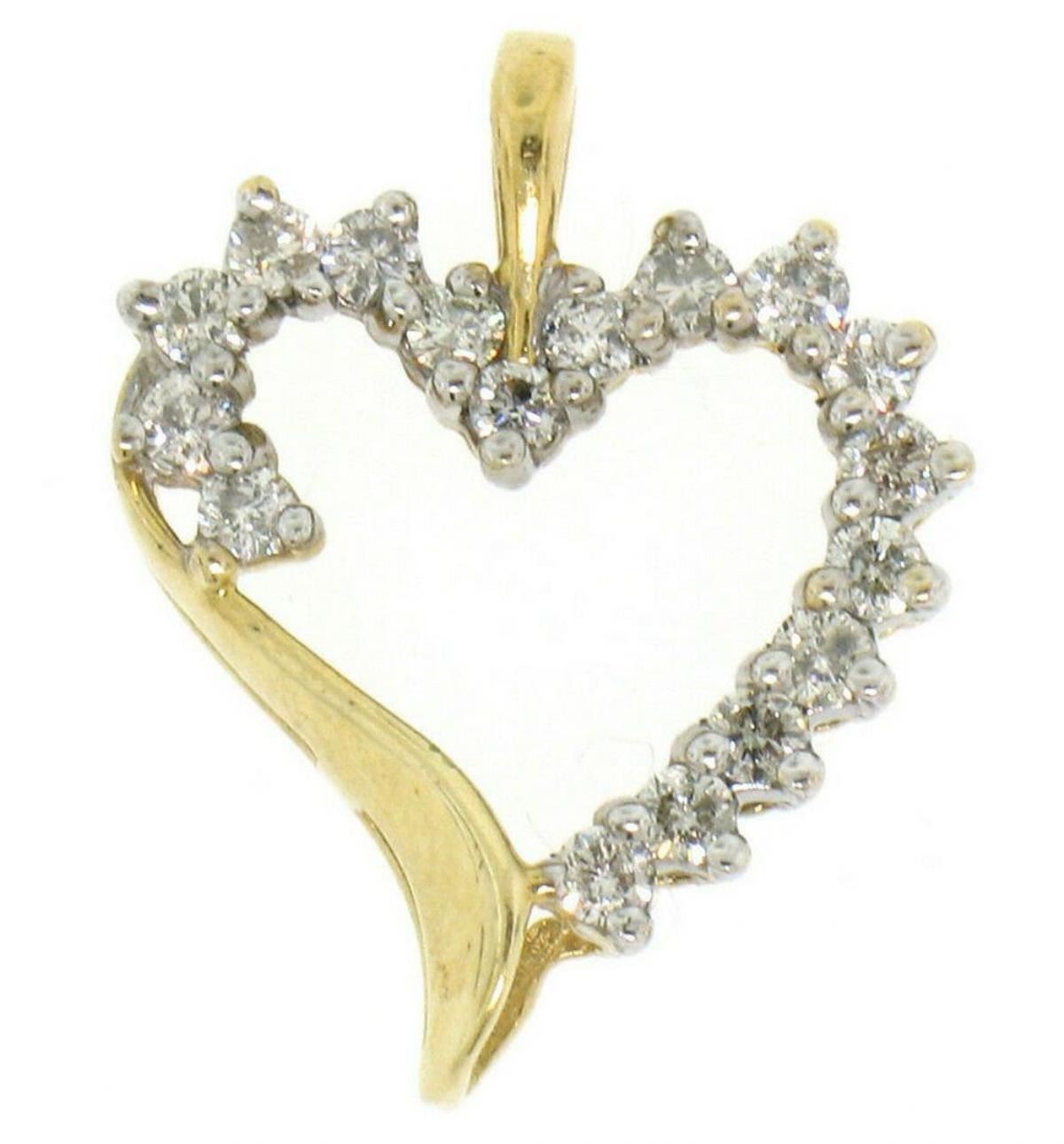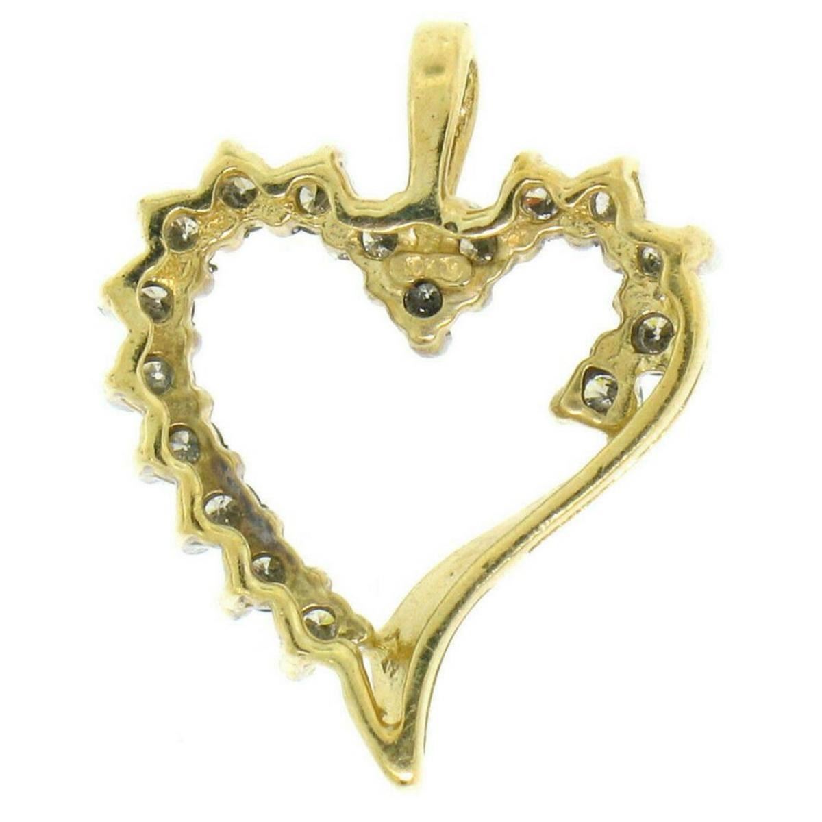 One 10k Yellow Gold .50 ctw Partially Round Diamond Outlined Open Heart Charm Pendant. Item Details: Material: 10K Solid Yellow Gold, Weight: 1.30 Grams, Stone(s): (17) Natural Genuine Diamonds - Round Brilliant Cut - F Color - I1 Clarity - 0.50 ctw (approx.), Dimensions: 16.65x20.74mm, Chain: This pendant does not come with a chain., Condition: Like New