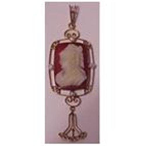 </font></strong>This 10K lavalier is 2 1/4" from the top to the tip. It is 11/16" wide. The figure is on a carnelian background.</font>