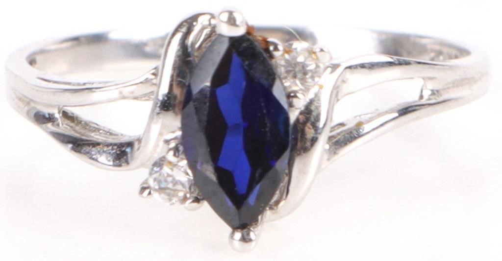 ~.40ct marquis cut sapphire in a 10K white gold band flanked by two small CZ round cut stones.