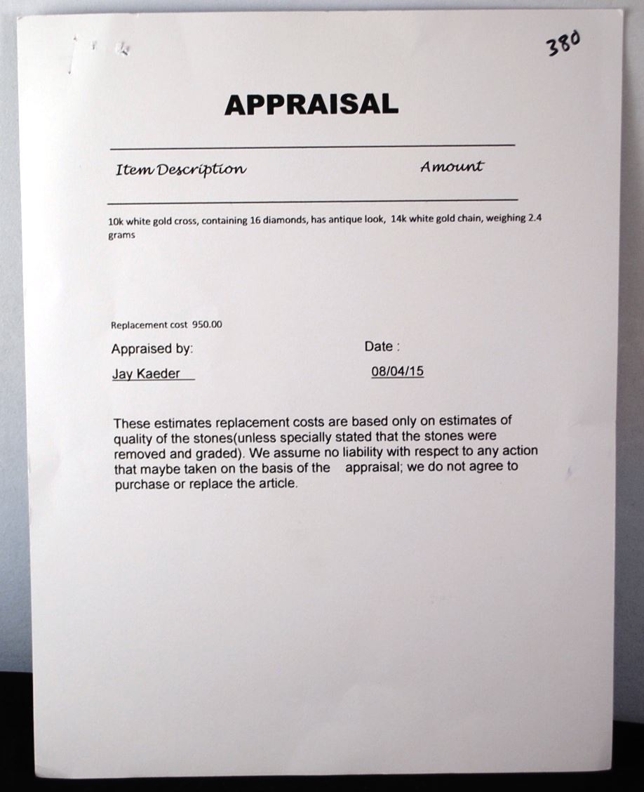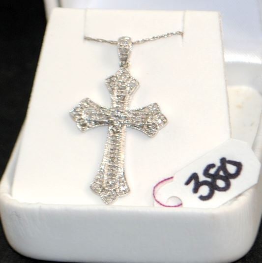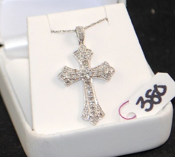 10K WHITE GOLD CROSS, CONTAINING 16 DIAMONDS, HAS ANTIQUE ;LOOK, 14K WHITE GOLD CHAIN THE APPRAISED REPLACEMENT COST IS $950.00. AND COMES WITH THE APPRAISAL FOR INSURANCE PURPOSES.