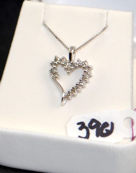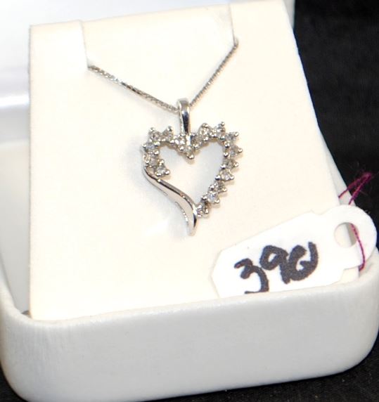 10K WHITE GOLD DIAMOND HEART PENDANT, CONTAINING 16 DIAMONDS ON A 14K WHITE GOLD CHAIN. THE APPRAISED REPLACEMENT COST IS $750.00. AND COMES WITH THE APPRAISAL FOR INSURANCE PURPOSES.