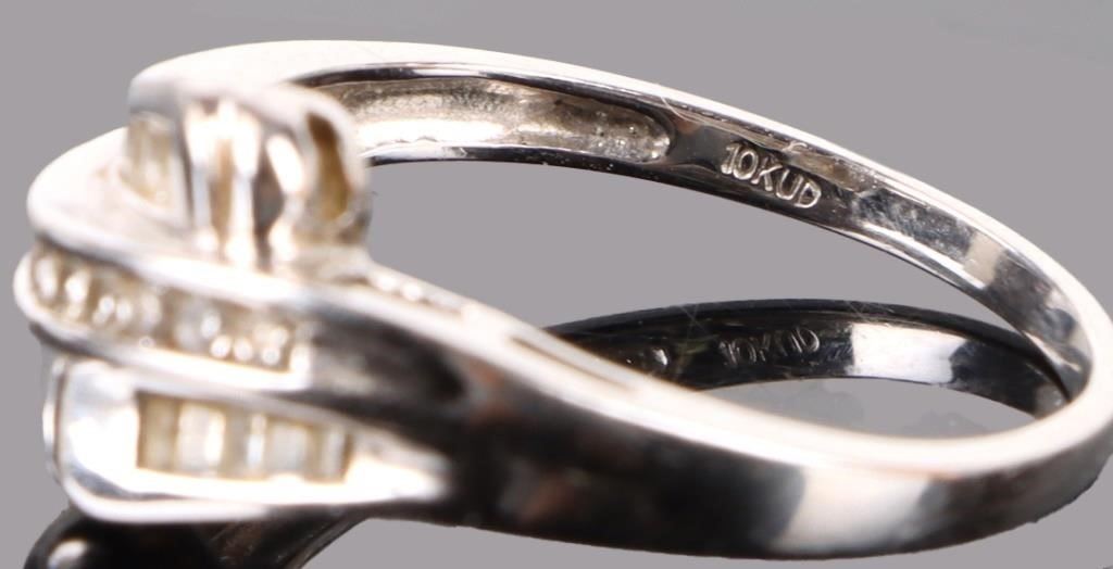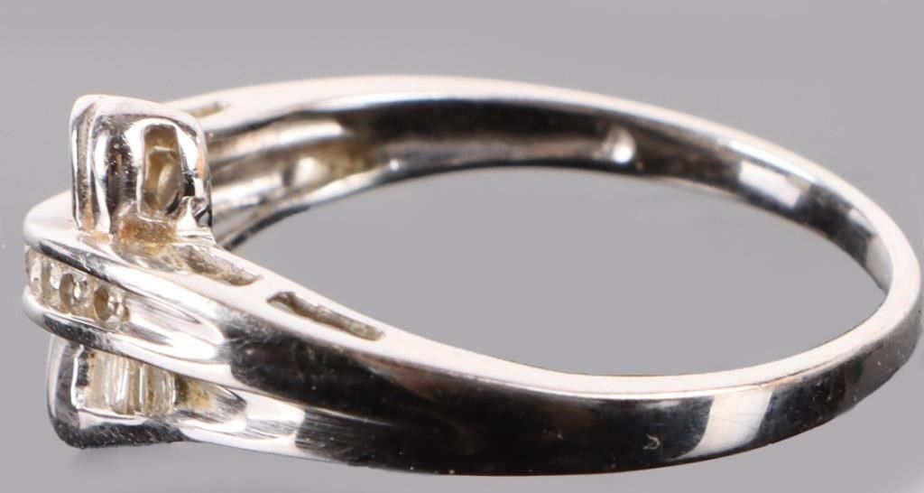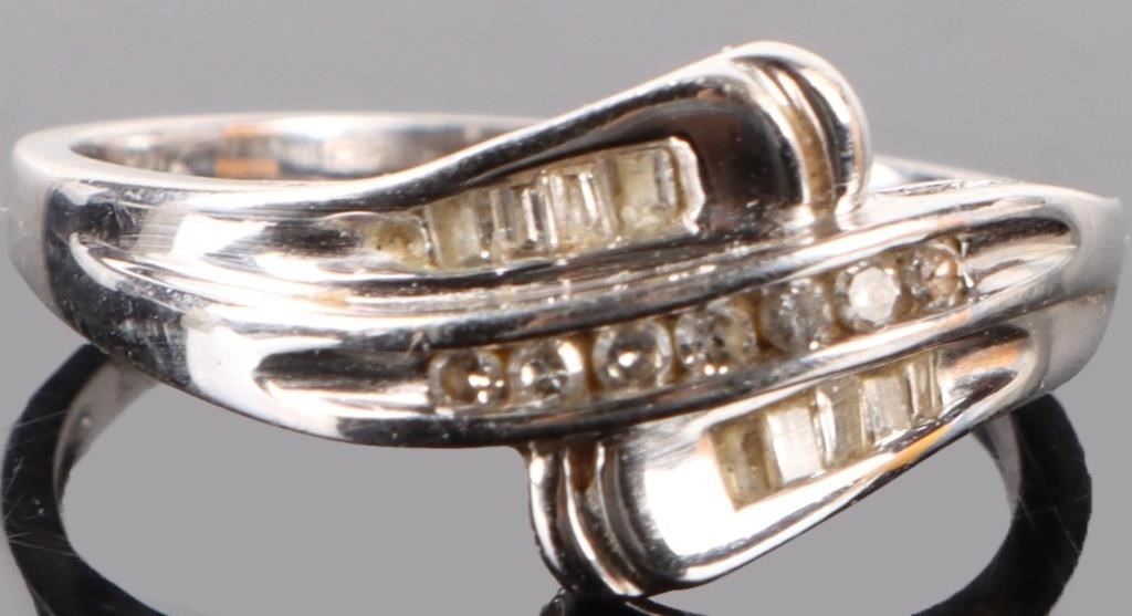 10k white gold diamond ladies ring with seven 0.01ct round diamonds and ten 0.02ct channel diamonds.