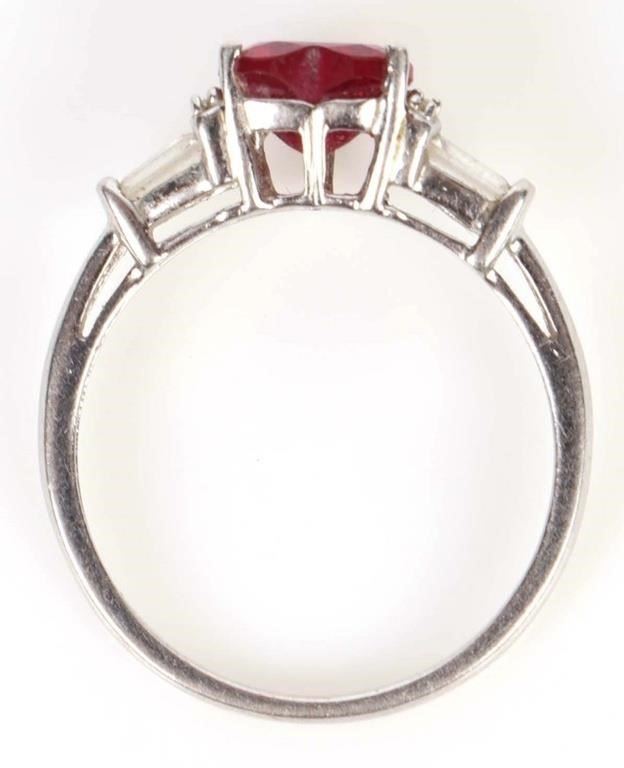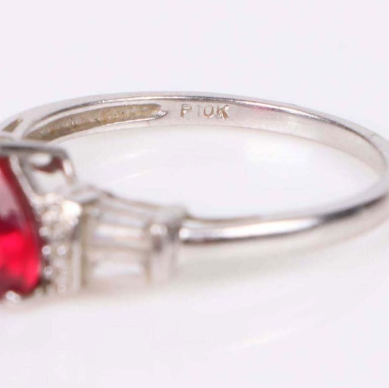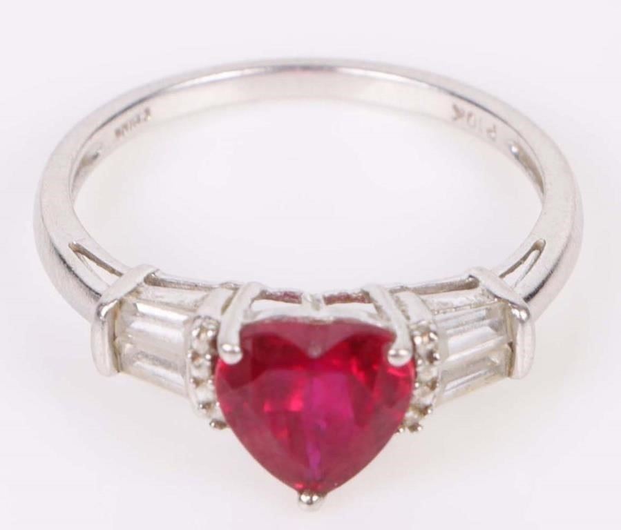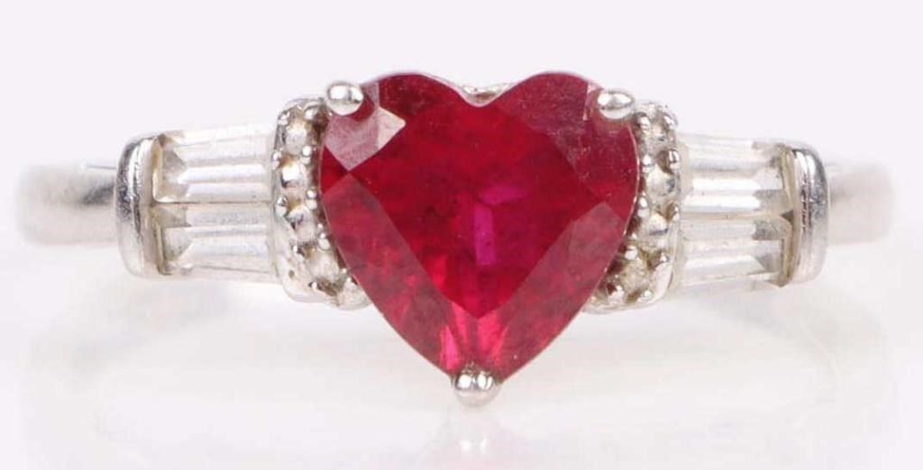 10K white gold ruby topaz ladies ring. Gemstones to include one 1.0ct heart cut ruby, and four 0.1ct rectangular cut topaz gemstones.