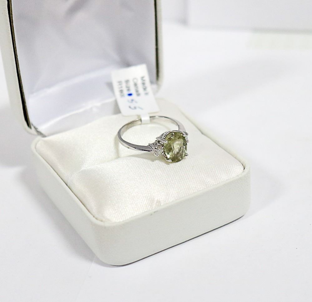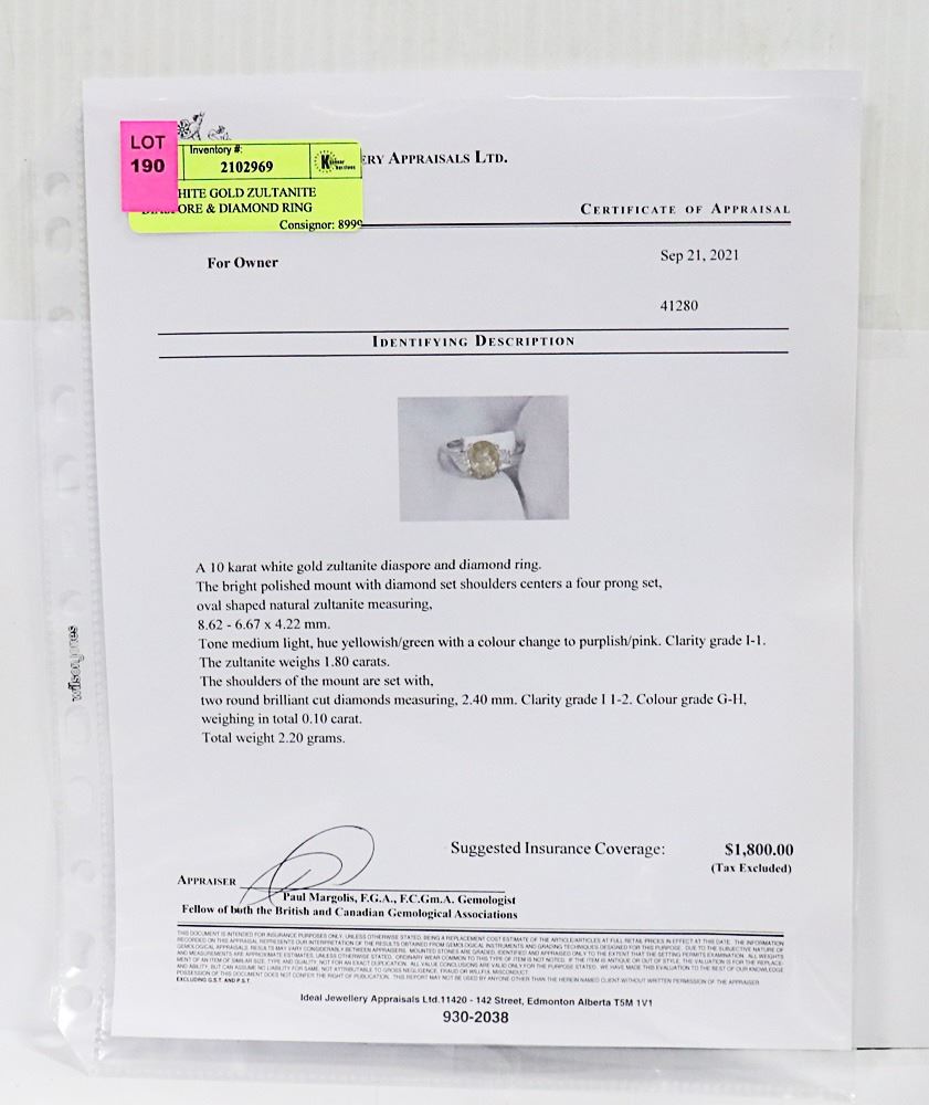 A SIZE: 5 1/2 - 10 KARAT WHITE GOLD ZULTANITE DIASPORE AND DIAMOND RING. THE BRIGHT POLISHED MOUNT WITH DIAMOND SET SHOULDSER CENTERS A FOUR PRONG SET, OVAL SHAPED NATURAL ZULTANITE MEASURING, 8.62-6.67 X 4.22MM. TONE MEDIUM LIGHT, HUE YELLOWISH/GREEN WITH A COLOUR CHANGE TO PURPLISH/PINK. CLARITY GRADE I-1. THE ZULTANITE WEIGHS 1.80 CARATS. THE SHOULDERS OF THE MOUNT ARE SET WITH, TWO ROUND BRILLIANT CUT DIAMONDS MEASURING, 2.40MM. CLARITY GRADE I 1-2. COLOURGRADE G-H, WEIGHING IN TOTAL 0.10 CARAT. TOTAL WEIGHT 2.20 GRAMS. SUGGESTED INSURANCE COVERAGE: $1800.00.