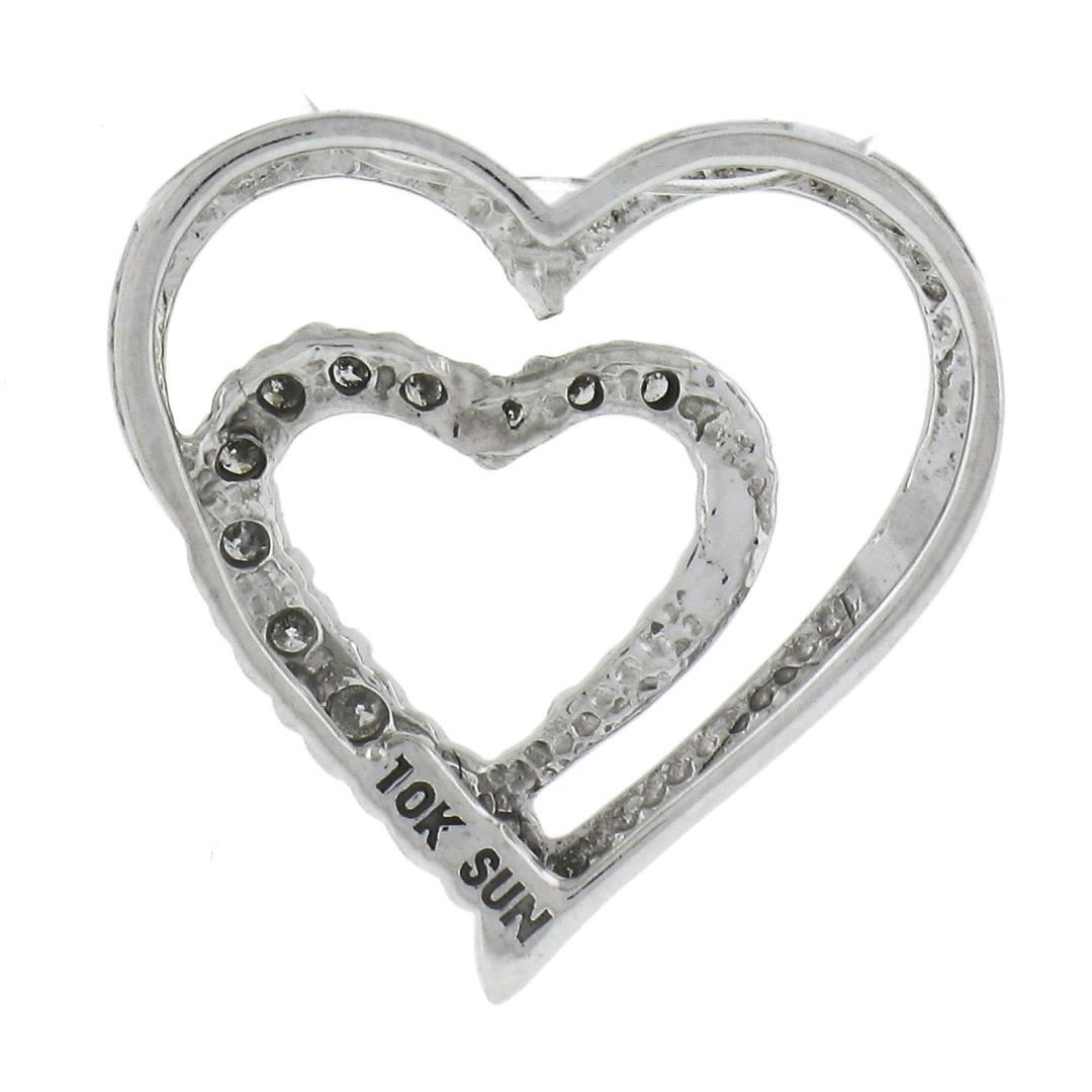 A solid 10k white gold heart slid pendant, with 11 round cut natural diamonds (H/I - I2 ; 0.12ctw). The pendant weighs a total of 1.10 grams, measures 16.4x16.5mm including the bail.