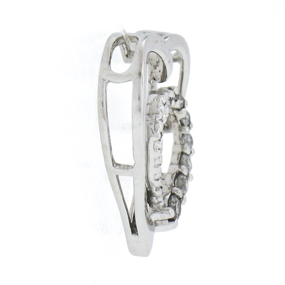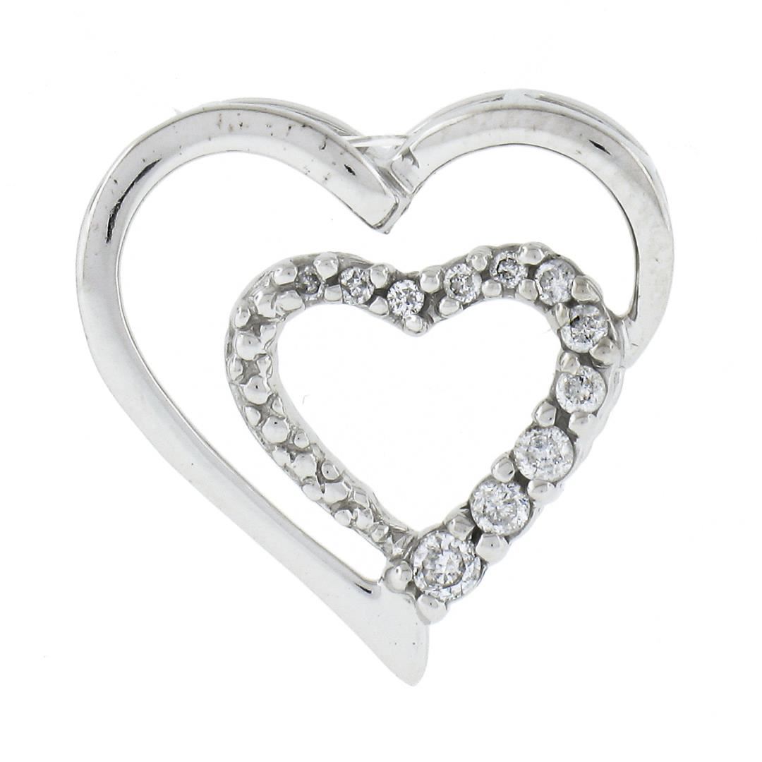 A solid 10k white gold heart slid pendant, with 11 round cut natural diamonds (H/I - I2 ; 0.12ctw). The pendant weighs a total of 1.10 grams, measures 16.4x16.5mm including the bail.