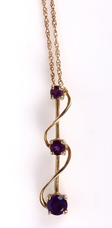 10k yellow gold necklace with Amethyst pendant. Pendant features 3 round cut Amethyst stones.