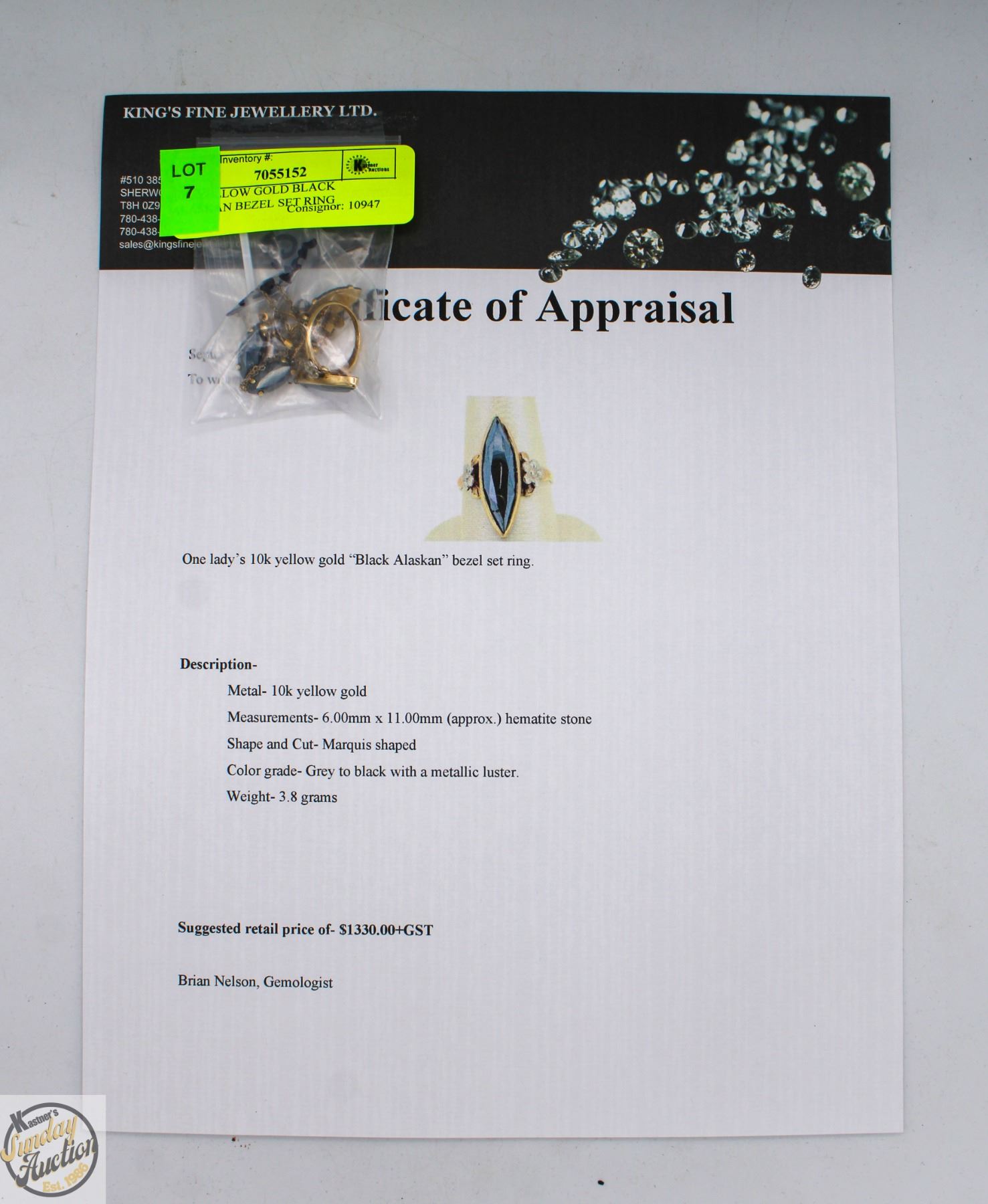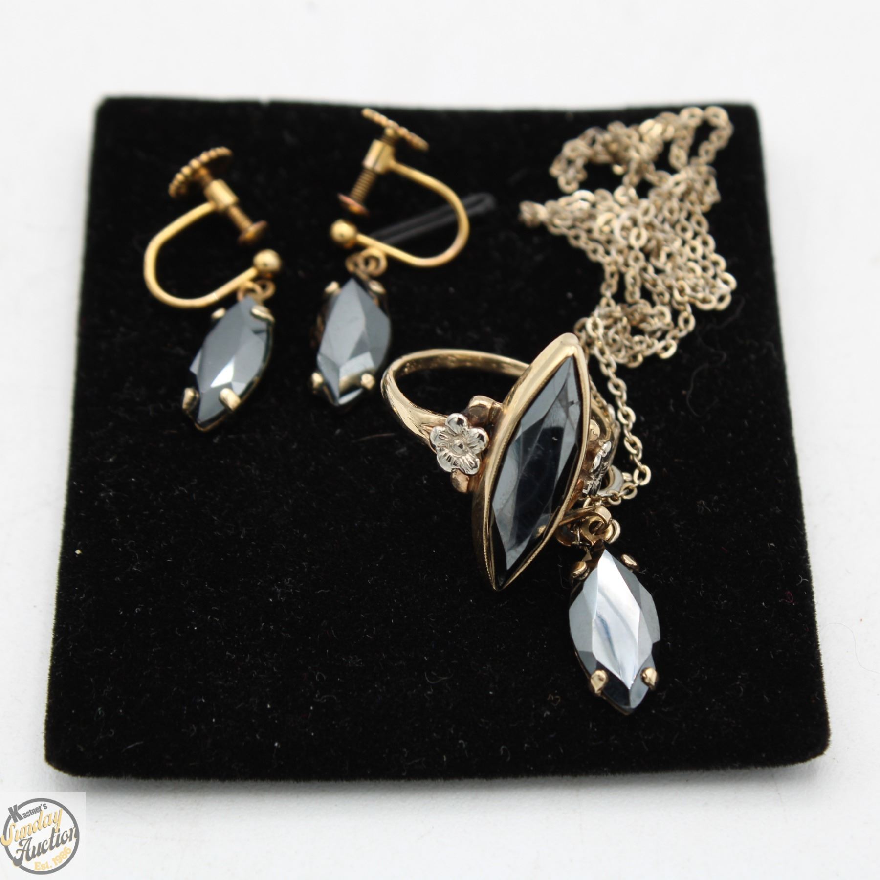 *RING IS BROKEN* STONE IS HEMATITE, MARQUIS SHAPED, WEIGHT IS 3.8G, SOLD WITH SIMILAR STYLE NECKLACE AND EARRINGS (HEMATITE STONES). COMES WITH APPRAISAL VALUED AT $1,330.00 **ALL ITEMS MUST BE REMOVED BY 5PM SATURDAY, OCTOBER 18TH 2025. ALL REMAINING ITEMS WILL BE SUBJECT TO A $6.00 PER DAY STORAGE CHARGE. ANY ITEMS REMAINING AFTER MONDAY, NOVEMBER 3RD 2025 WILL BE CONSIDERED FORFEITED. NO REFUNDS WILL BE ISSUED FOR FORFEITED ITEMS. TO SCHEDULE A PICK UP APPOINTMENT CLICK HERE