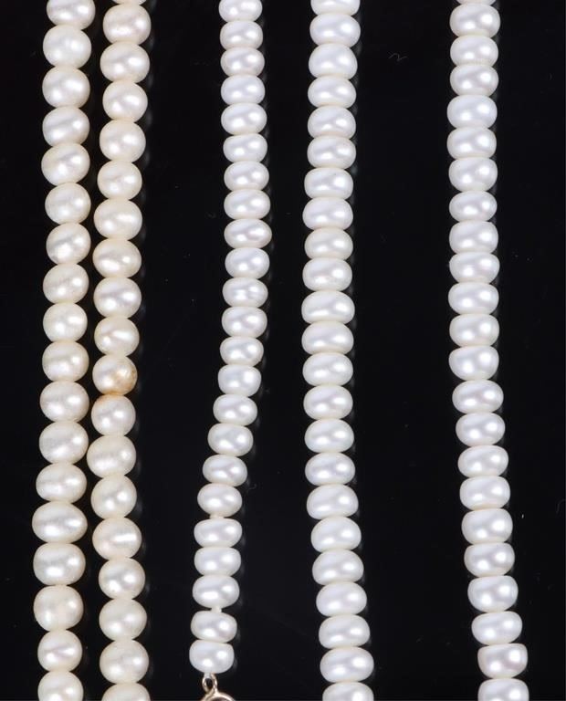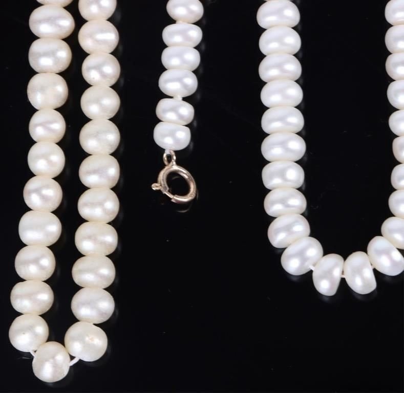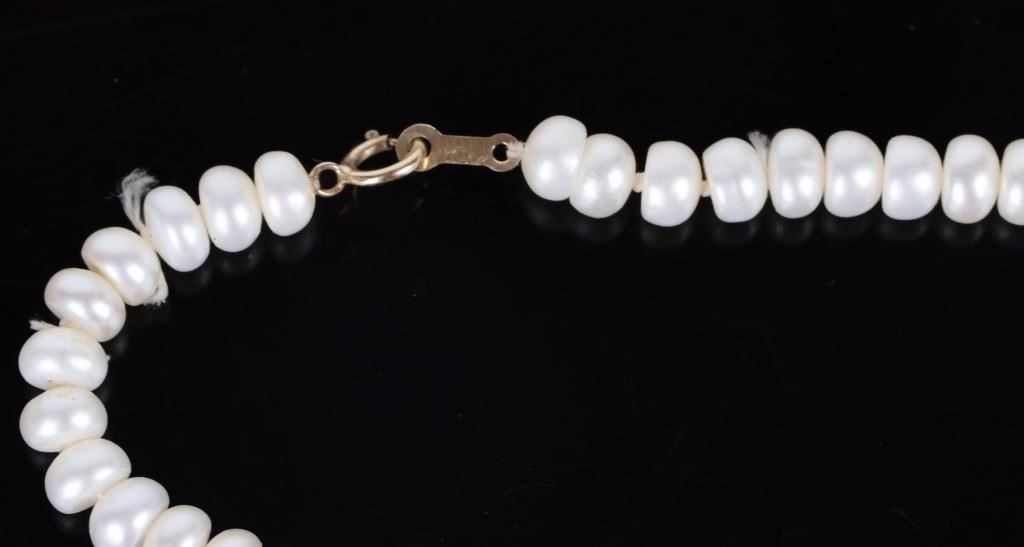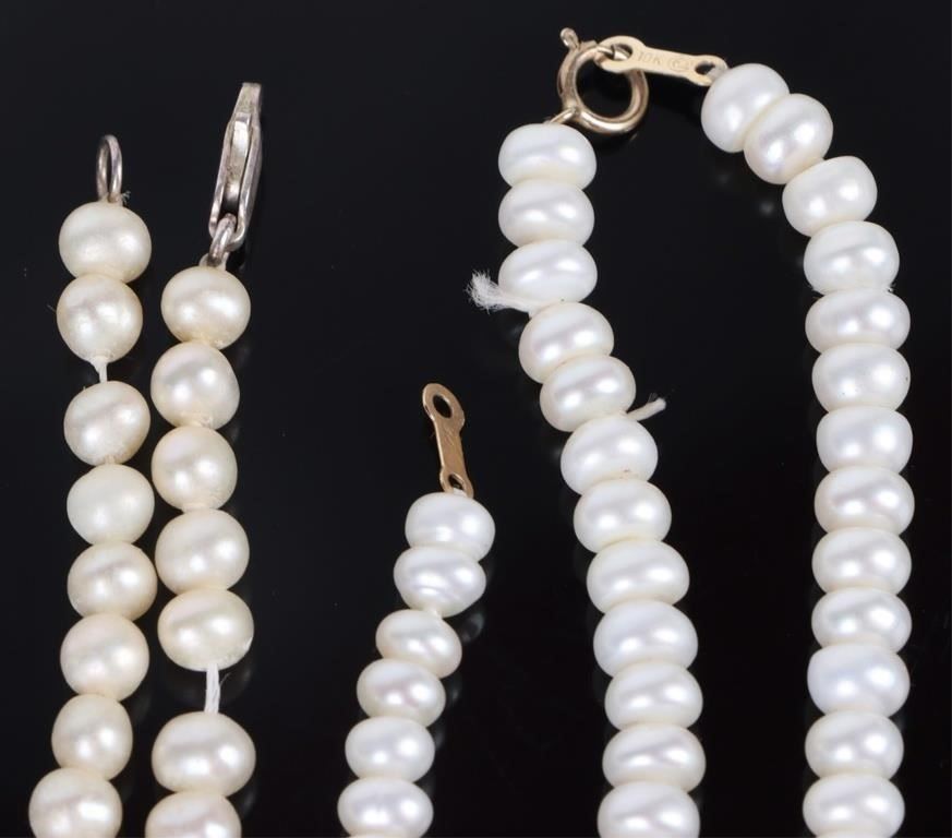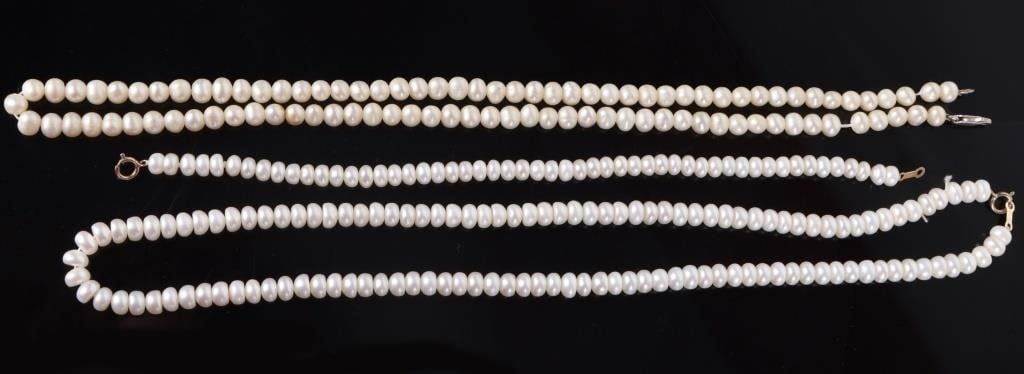 10K yellow gold clasped white pearl ladies jewelry to include two necklace and one bracelet.