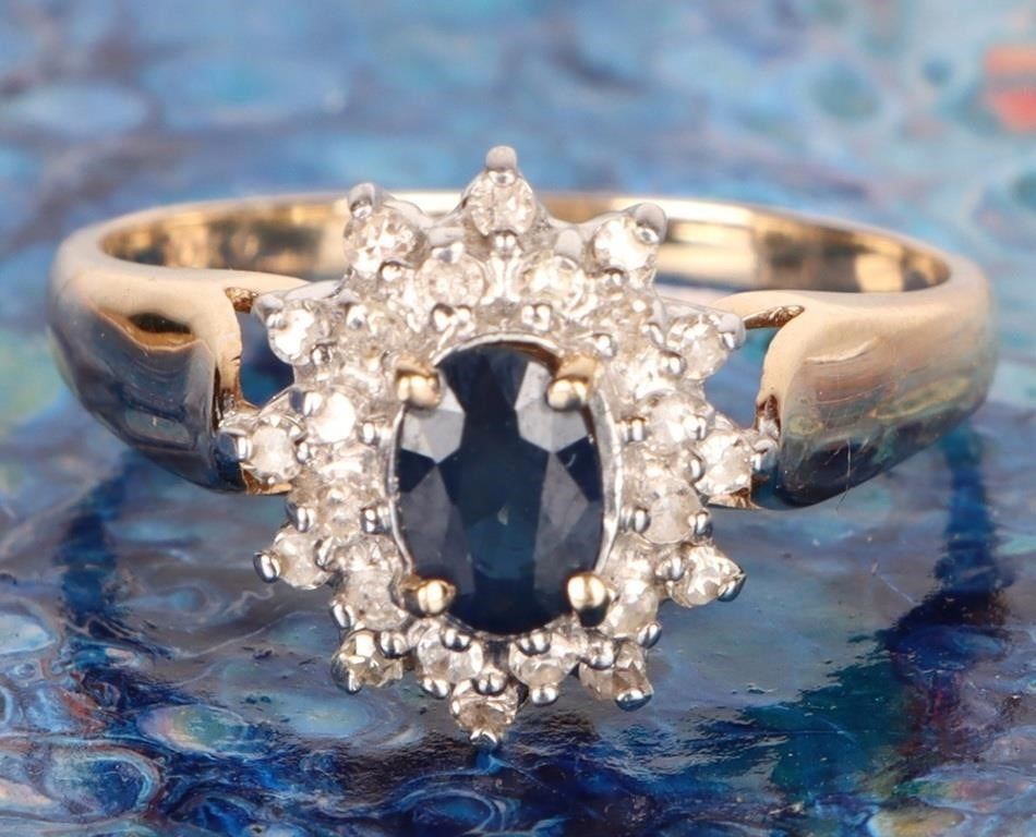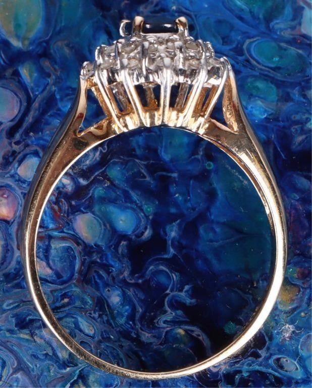 10K yellow gold diamond sapphire ladies ring with one 0.50CT oval blue sapphire and twenty-three 0.01CT round diamonds.