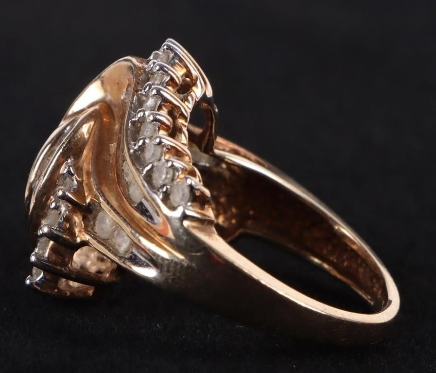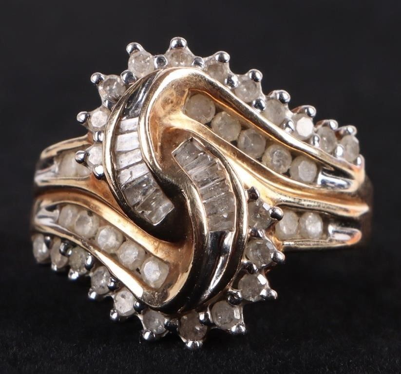 10K yellow gold diamond swirl ladies ring to include 36 0.02CT round cut diamonds, and 12 0.01-0.02CT trapezoidal cut diamonds.