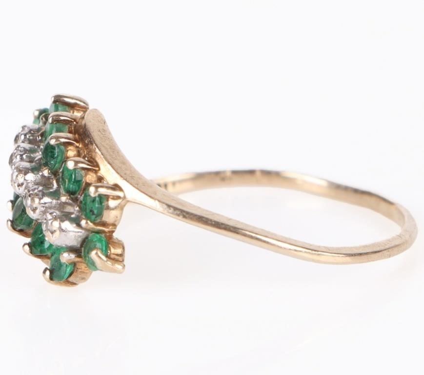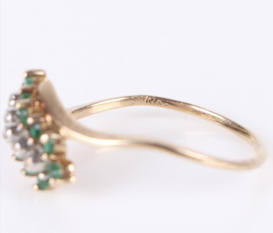 10K yellow gold emerald diamond ladies ring. Gemstones to incude twelve 0.03ct round cut emeralds, and five 0.005ct round cut diamonds.