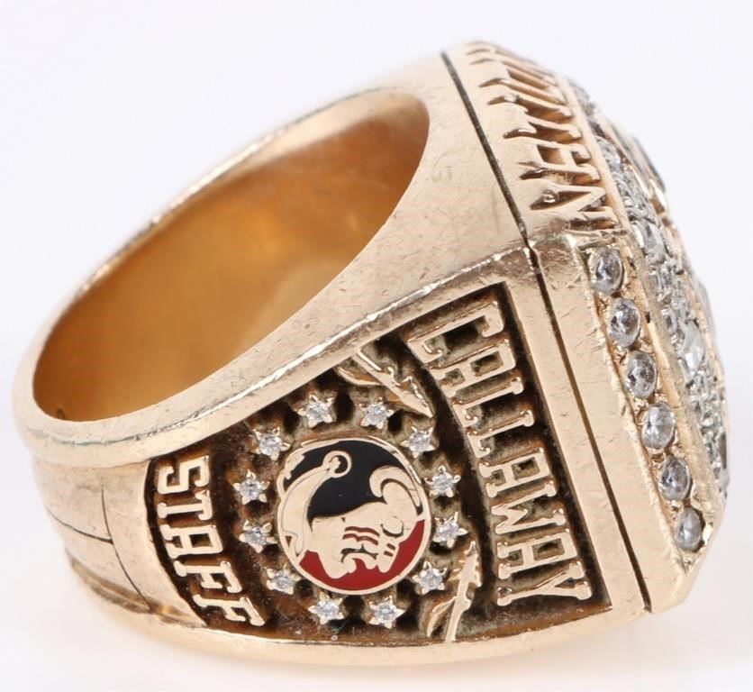 10K yellow gold FSU 1999 National Champion ring belonging to Jimmie Callaway. Engraved on the side of the ring as "Callaway Staff" filled with various round, baguette, and marquise cut CZ and beautiful engraved FSU mascots/ football podium.