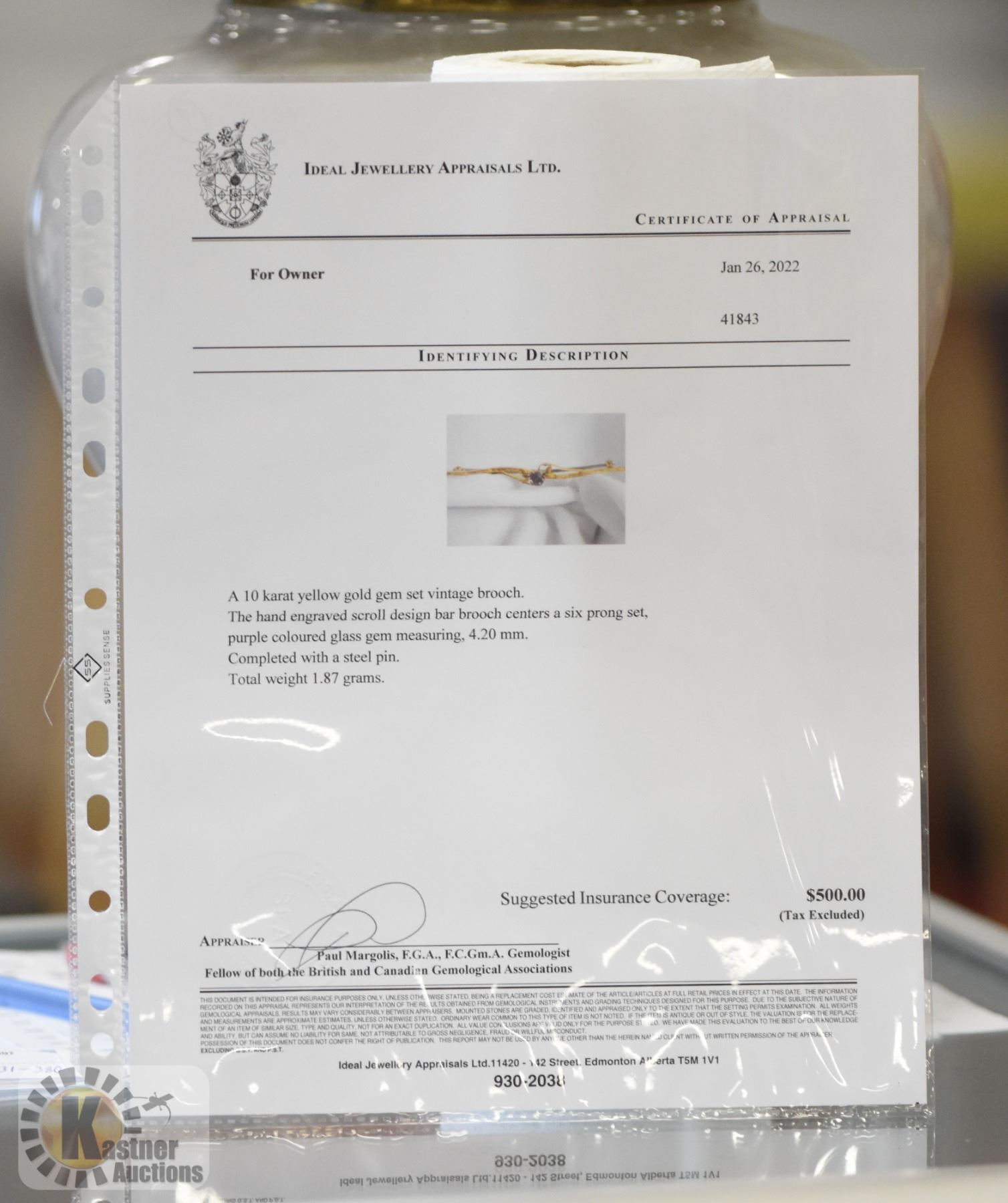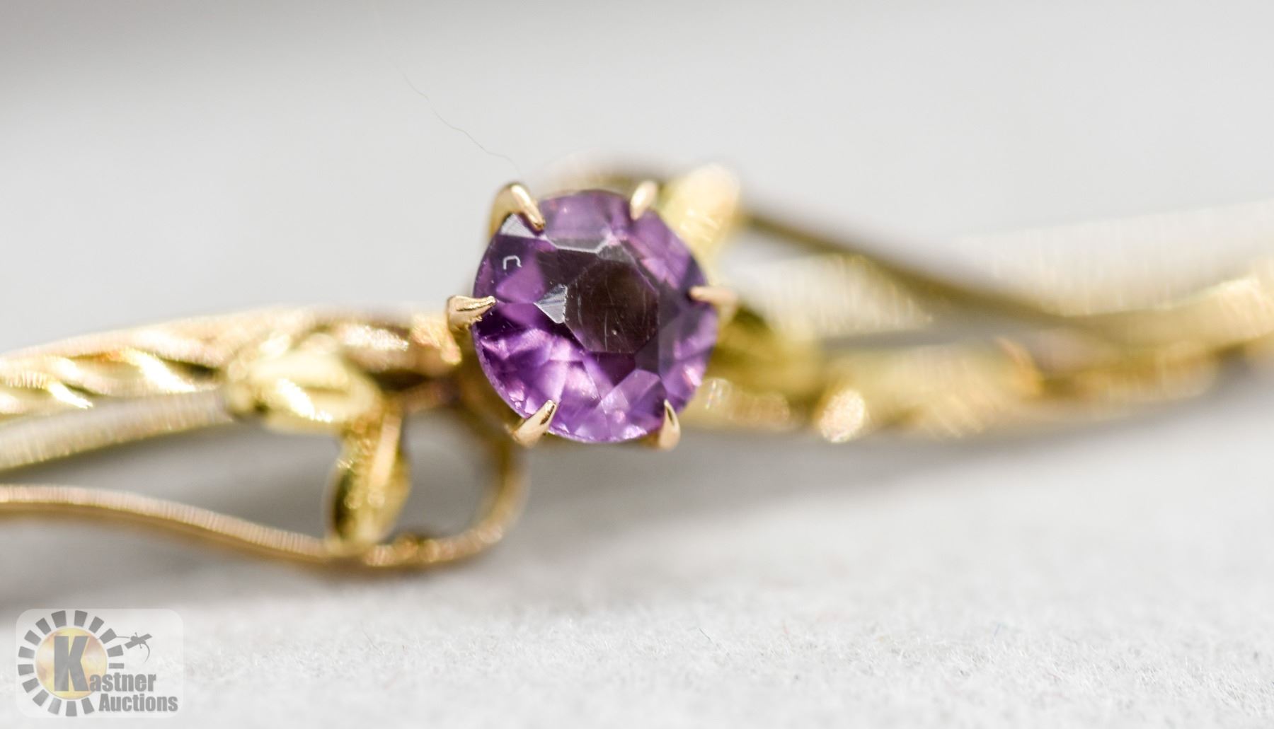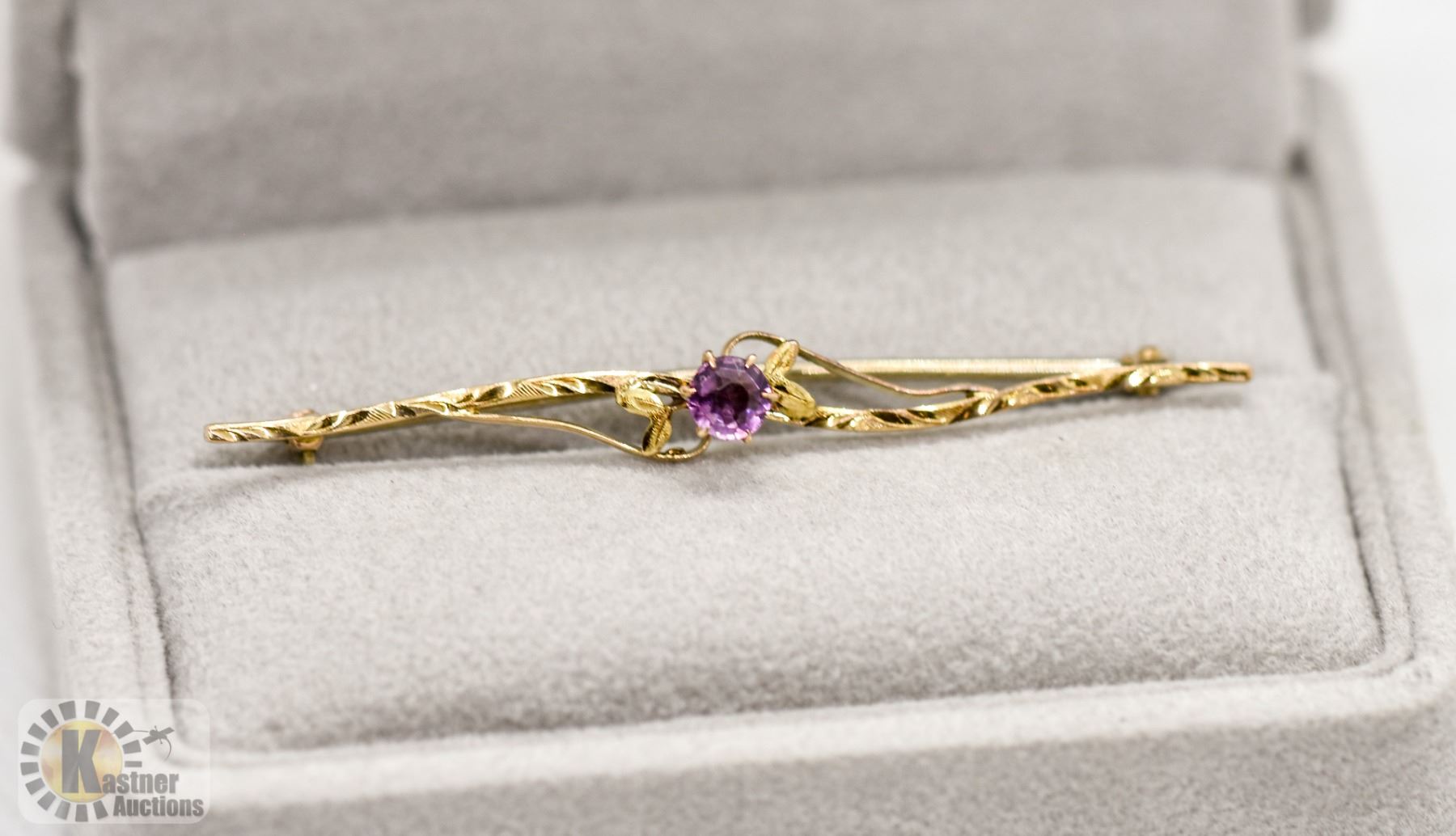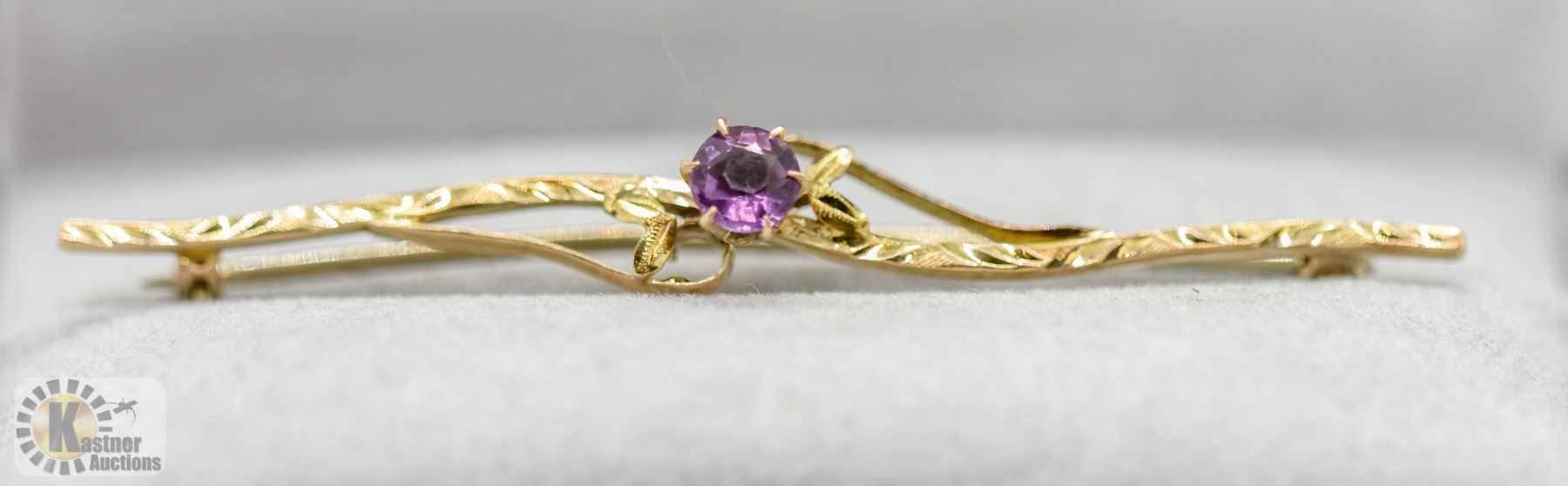 HAND ENGRAVED SCROLL DESIGN BAR BROOCH CENTERS A SIX PRONG SET, PURPLE COLORED GLASS GEM MEASURING 4.20 mm, BROOCH IS ON A STEEL PIN. COMES WITH A CERTIFICATE OF AUTHENTICITY, APPRAISED AT $500.00