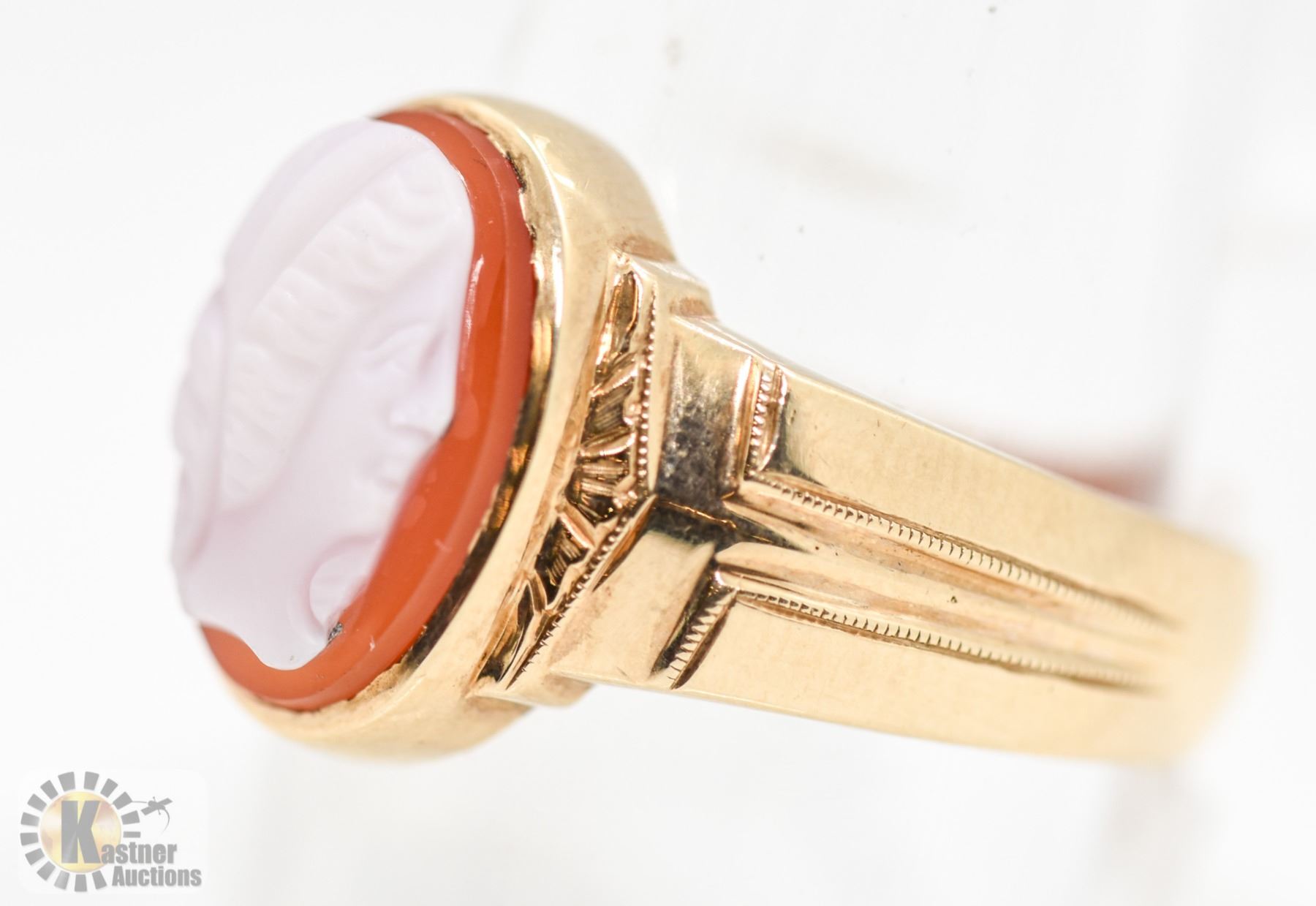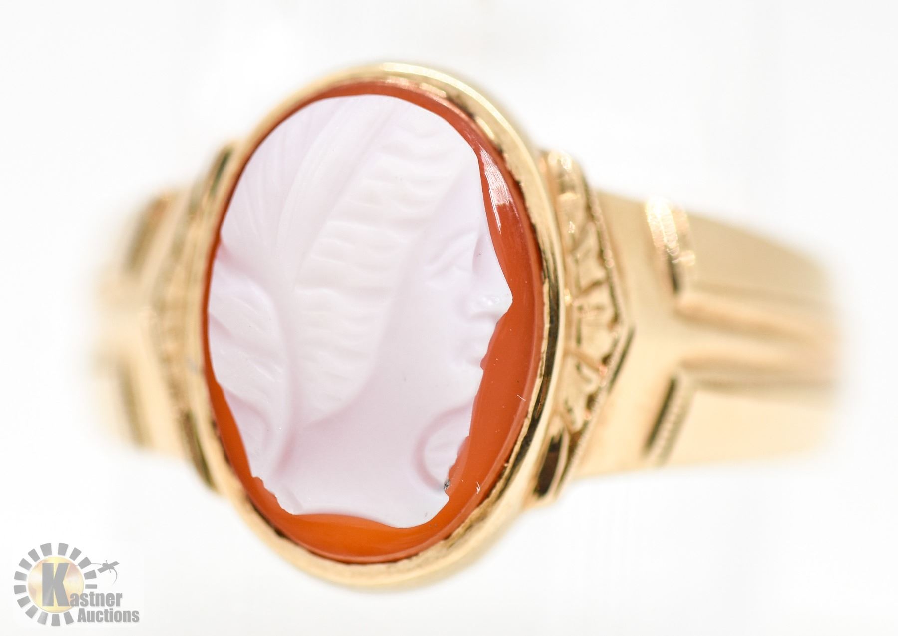 VINTAGE HARD STONE CAMEO RING, BRIGHT CUT HAND ENGRAVED ART DECO MOUNT CENTERS A FULL BEZEL SET, SARDONYX CHALCEDONY NEOCLASSICAL CAMEO MEASURING 14.00-10.00 MM. COMES WITH CERTIFICATE OF AUTHENTICITY, APPRAISED AT $1,800.00