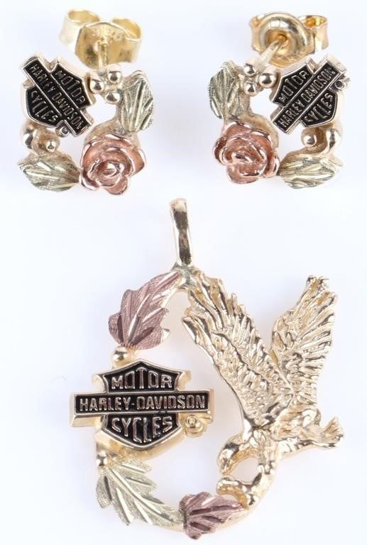 10k yellow and rose gold Harley Davidson matching earrings and pendant.