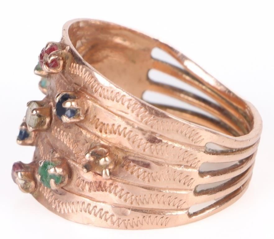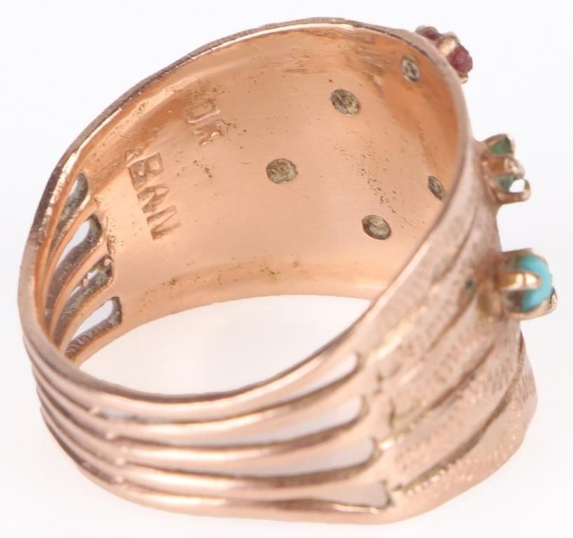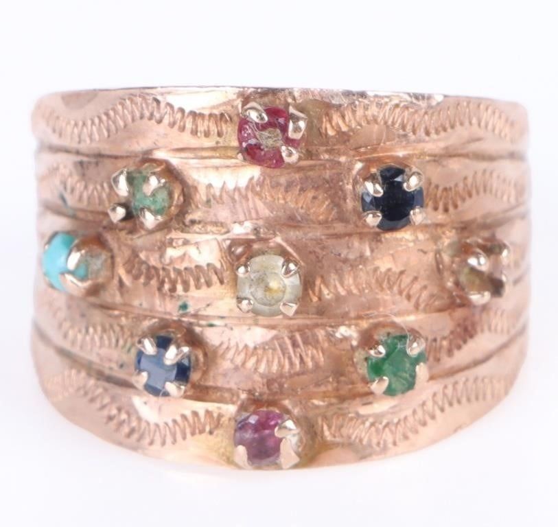 10k yellow gold multi-gemstone ladies ring with turquoise, emerald, ruby, sapphire, and more.