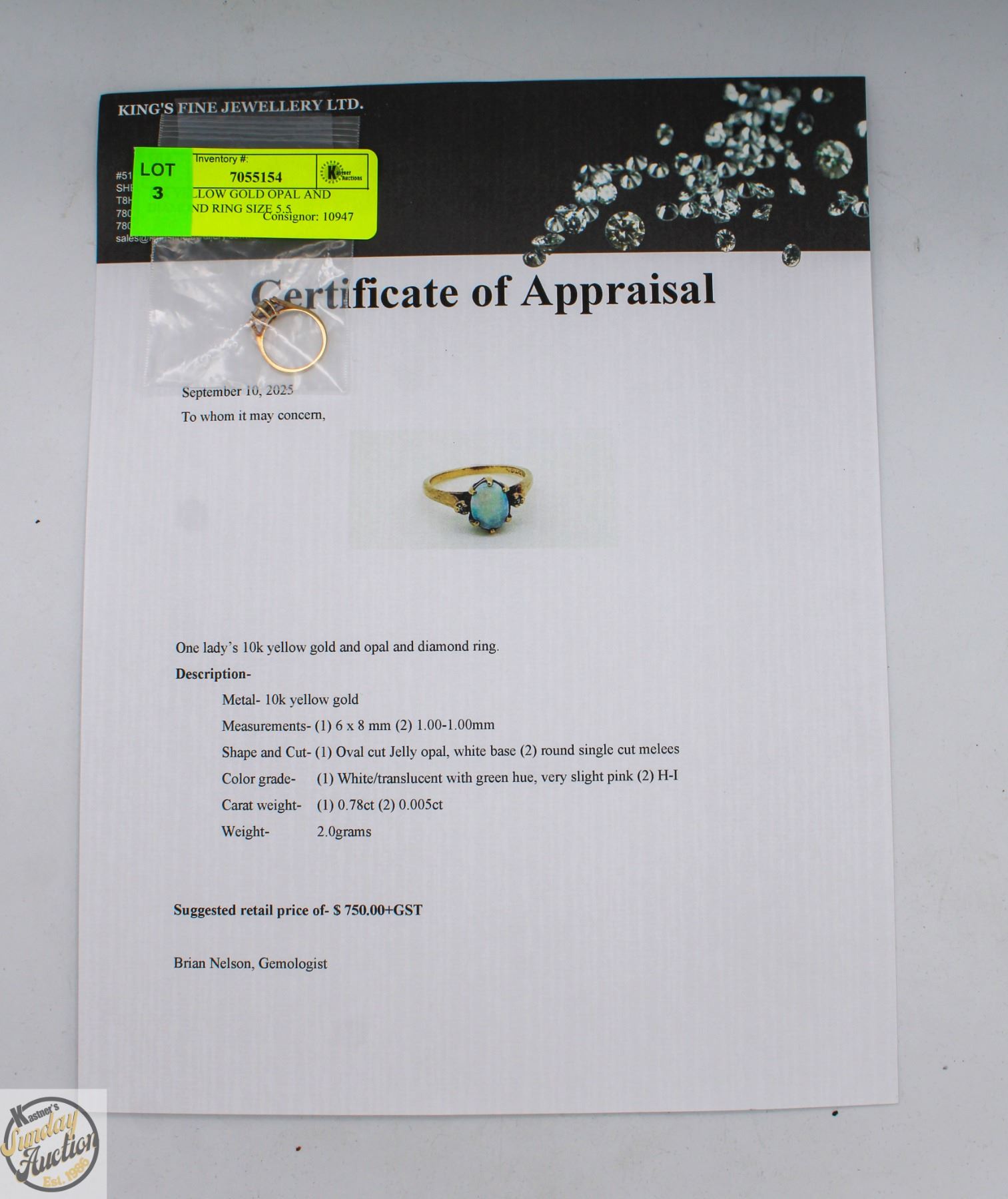 6 X 8MM (2) 1-1.00MM, OVAL CUT JELLY OPAL, WHITE BASE, ROUND SINGLE CUT MELEE, WHITE TRANSLUCENT WITH GREEN HUE, VERY SLIGHT PINK (2) H-I, 0.78CT (2) 0.005CT. WEIGHT 2G. COMES WITH APPRAISAL, VALUED AT $750.00 **ALL ITEMS MUST BE REMOVED BY 5PM SATURDAY, OCTOBER 11TH 2025. ALL REMAINING ITEMS WILL BE SUBJECT TO A $6.00 PER DAY STORAGE CHARGE. ANY ITEMS REMAINING AFTER MONDAY, NOVEMBER 3RD 2025 WILL BE CONSIDERED FORFEITED. NO REFUNDS WILL BE ISSUED FOR FORFEITED ITEMS. TO SCHEDULE A PICK UP APPOINTMENT CLICK HERE