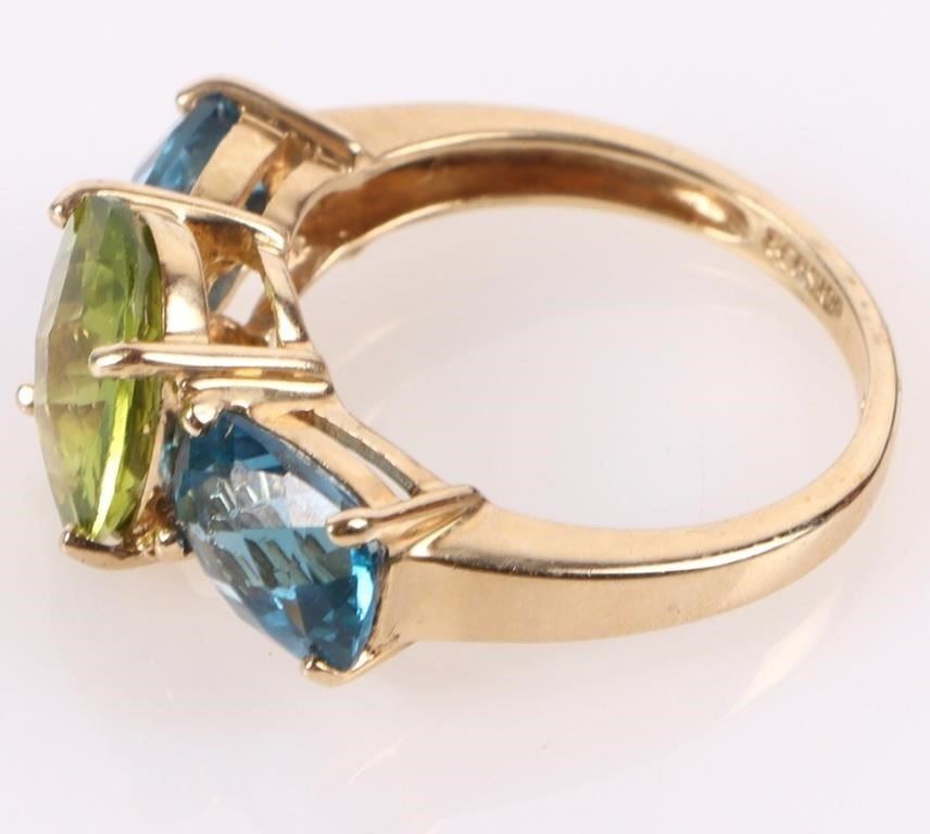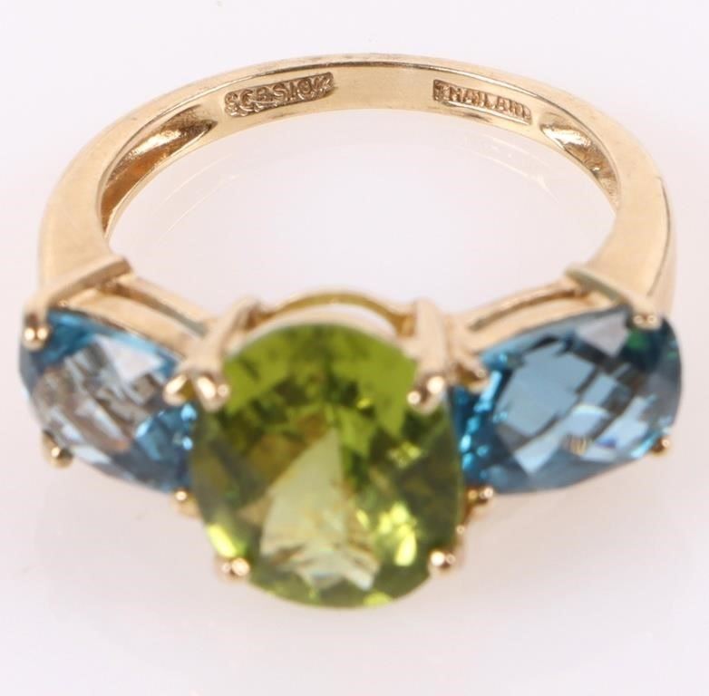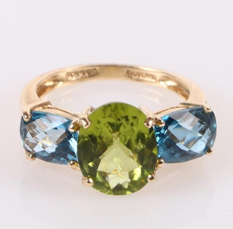 10k yellow gold peridot topaz ladies ring with one 4.0ct oval peridot and two 1.0ct cushion-cut topaz.