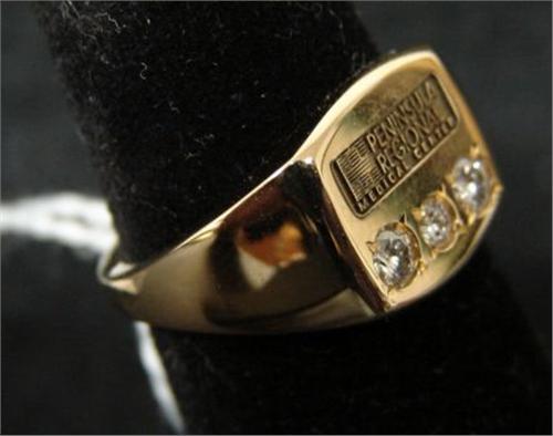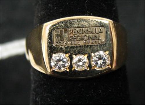 10K YELLOW GOLD PENINSULA REGIONAL MEDICAL CENTER RING. Has approx. (2) .10 ct. & (1) .06 ct. round diamonds. SI1 & H color. Wt. of ring is 5.3 grams. Size 6. Has CAGA appraisal.