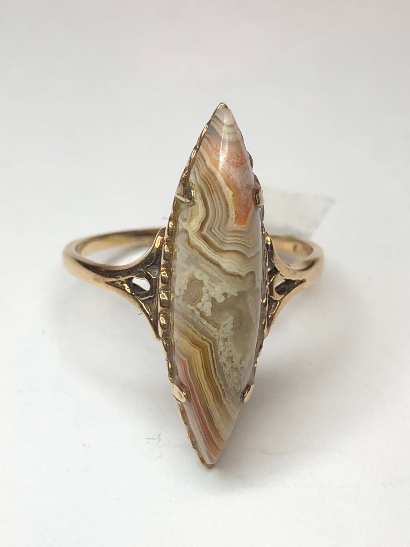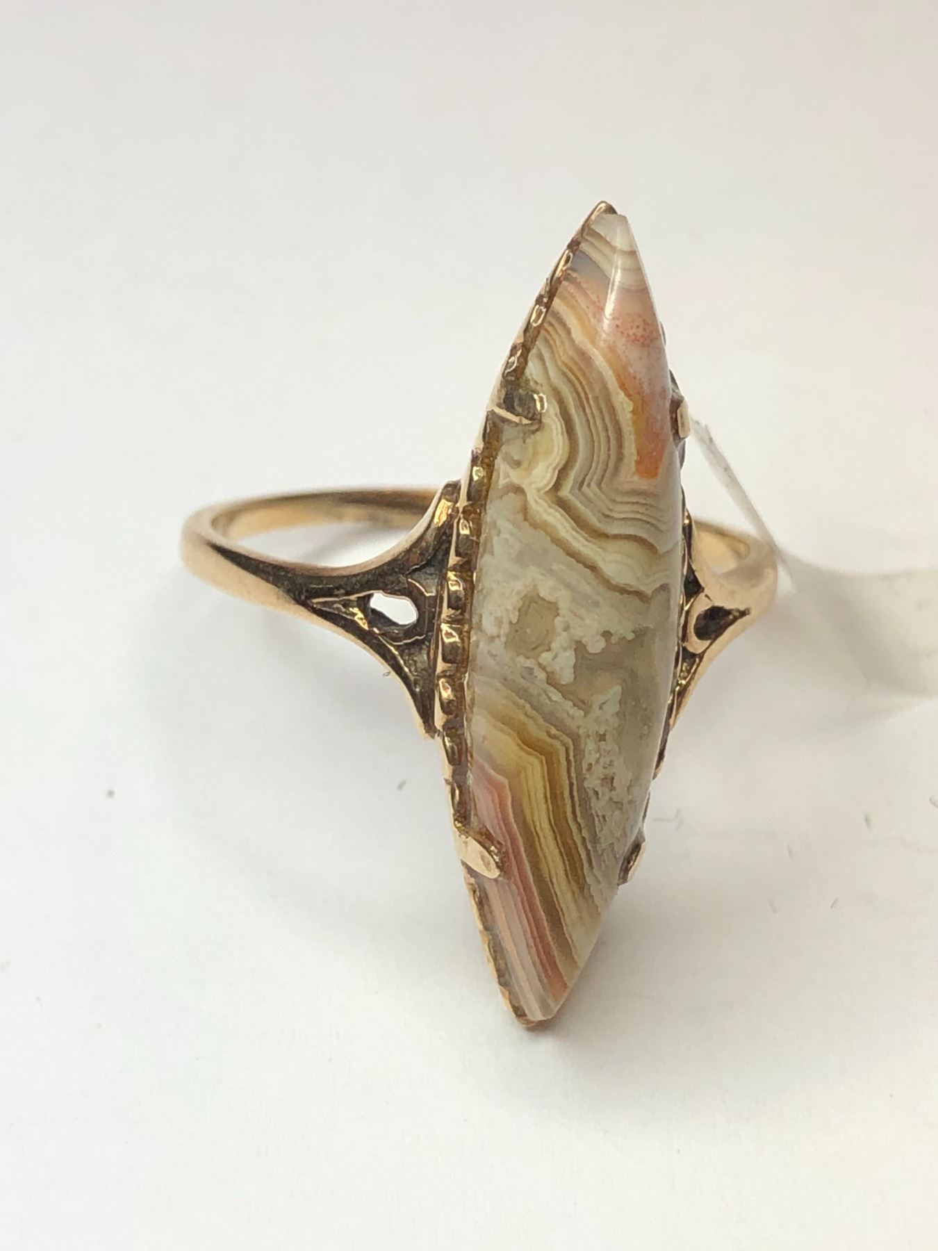 10K Yellow Gold Agate Ring Weight: 3.69g 10K Yellow Gold Stone: Cabochon Cut Agate Current Size: 9