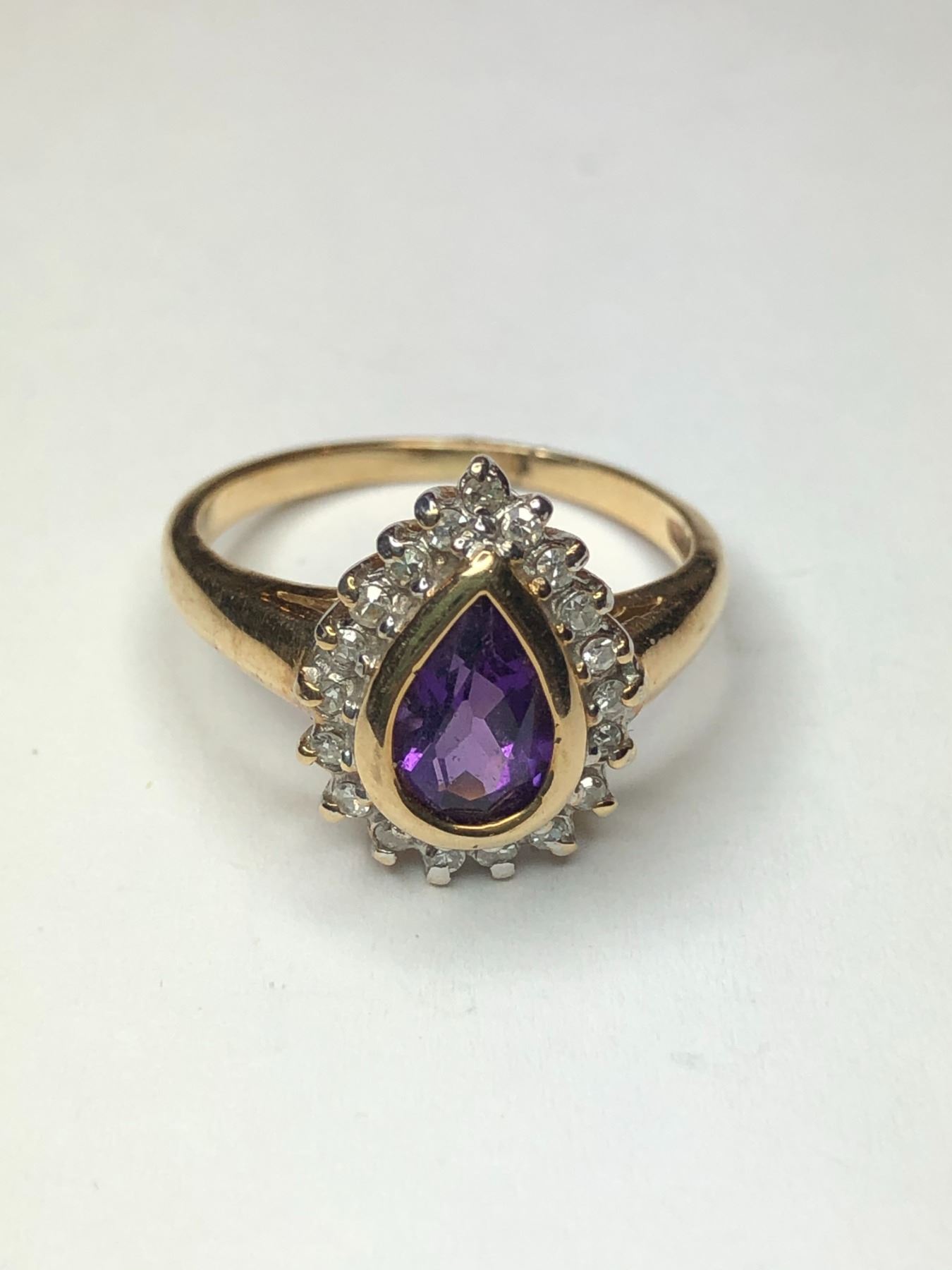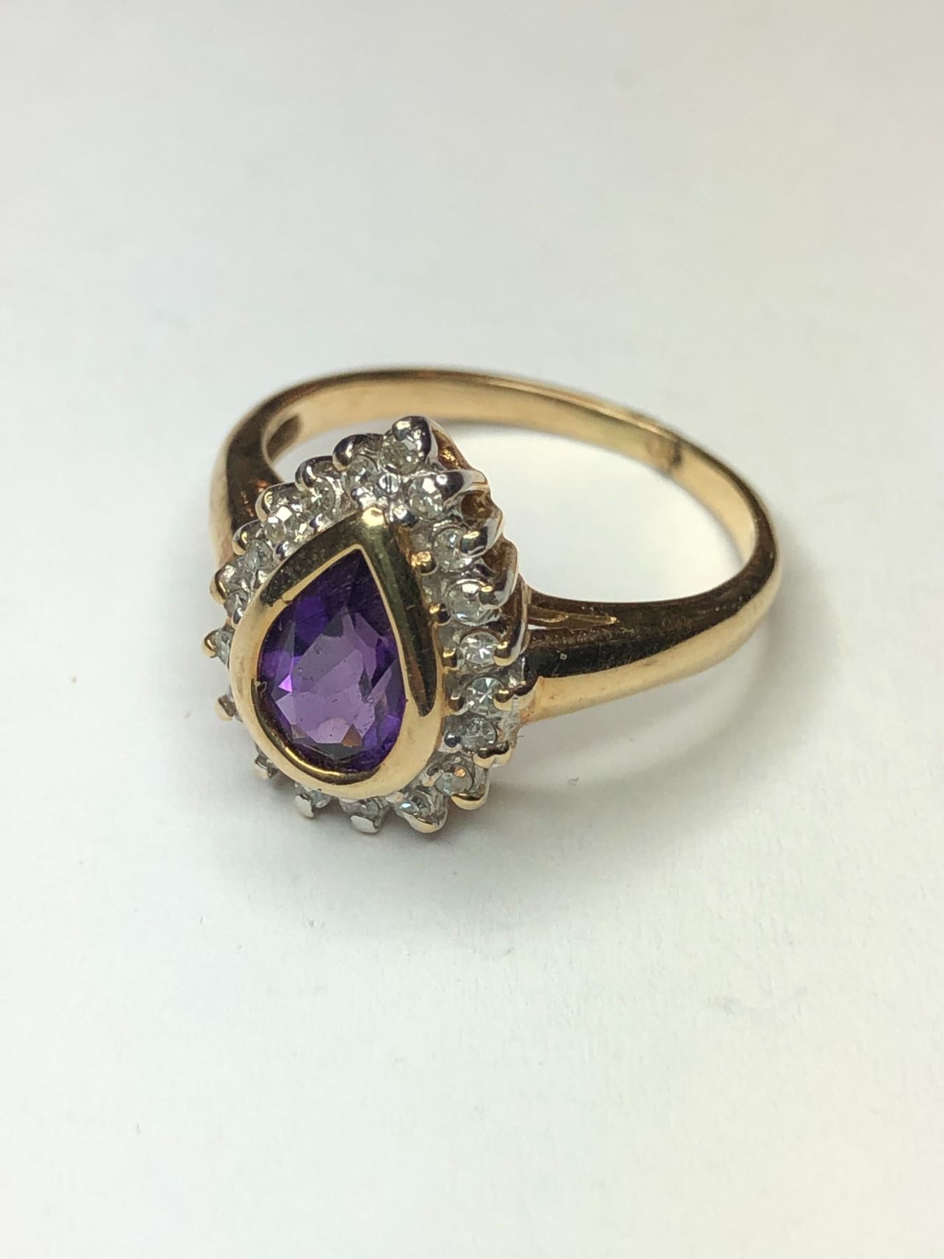 10K Yellow Gold Amethyst and Diamond Ring Weight: 2.5g 10K Yellow Gold Stones: Amethyst and Diamond Melee Halo Current Size: 5