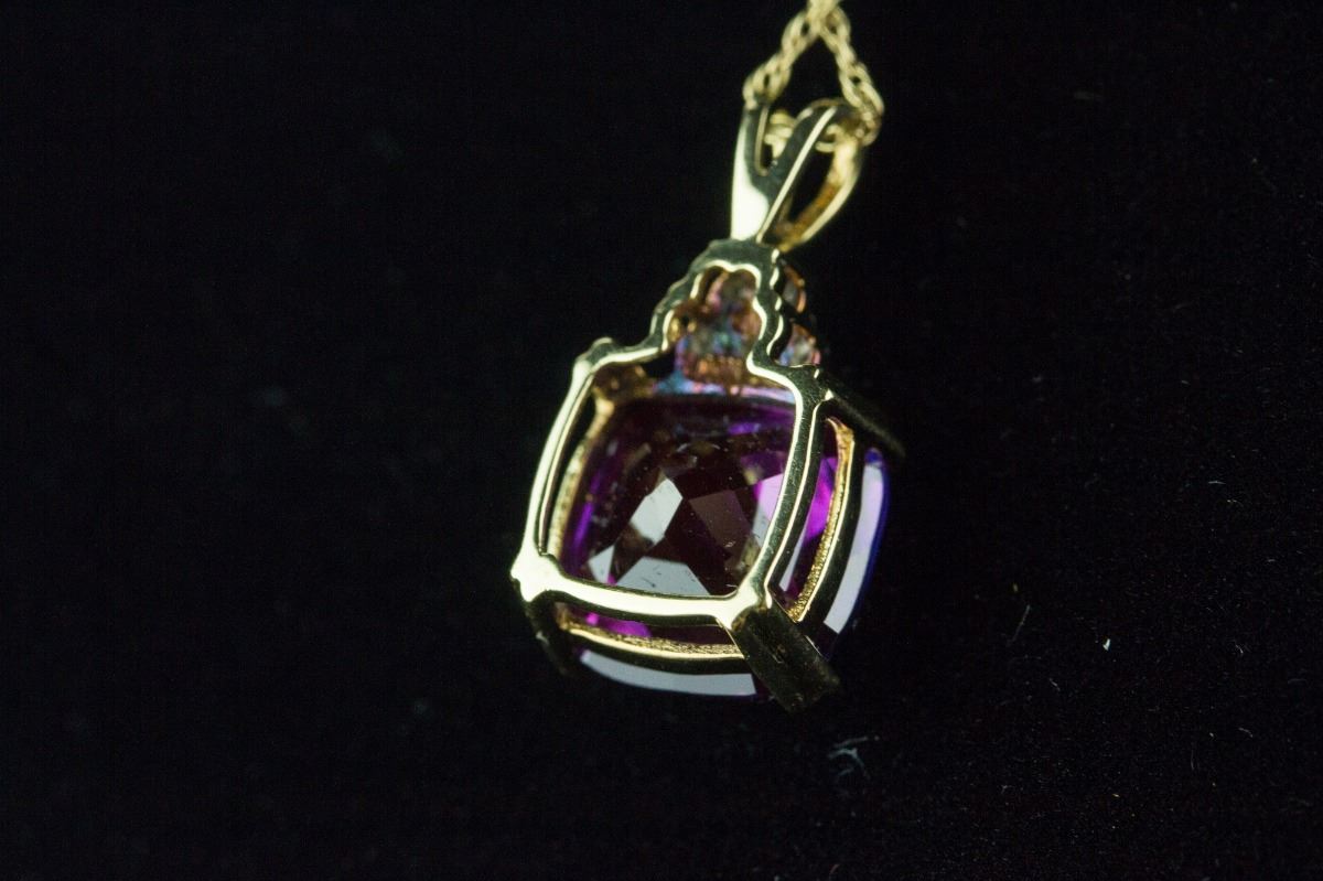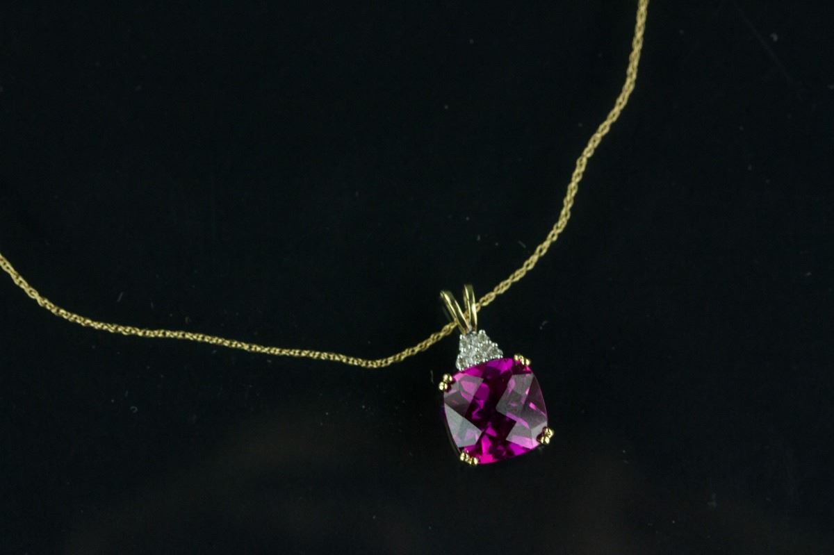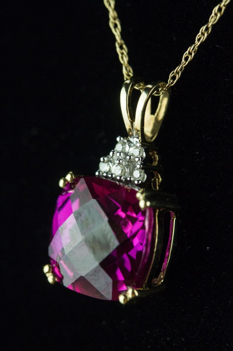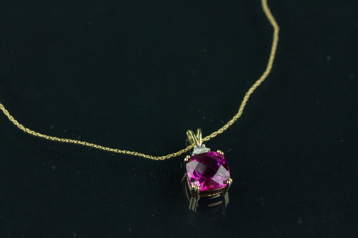 Fine ruby pendant necklace; set with cushion-shaped facet-cut ruby and five brilliant-cut diamonds; the necklace clasp stamped with 10K gold mark; H: 1.9 cm, W: 0.9 cm, 3 grams