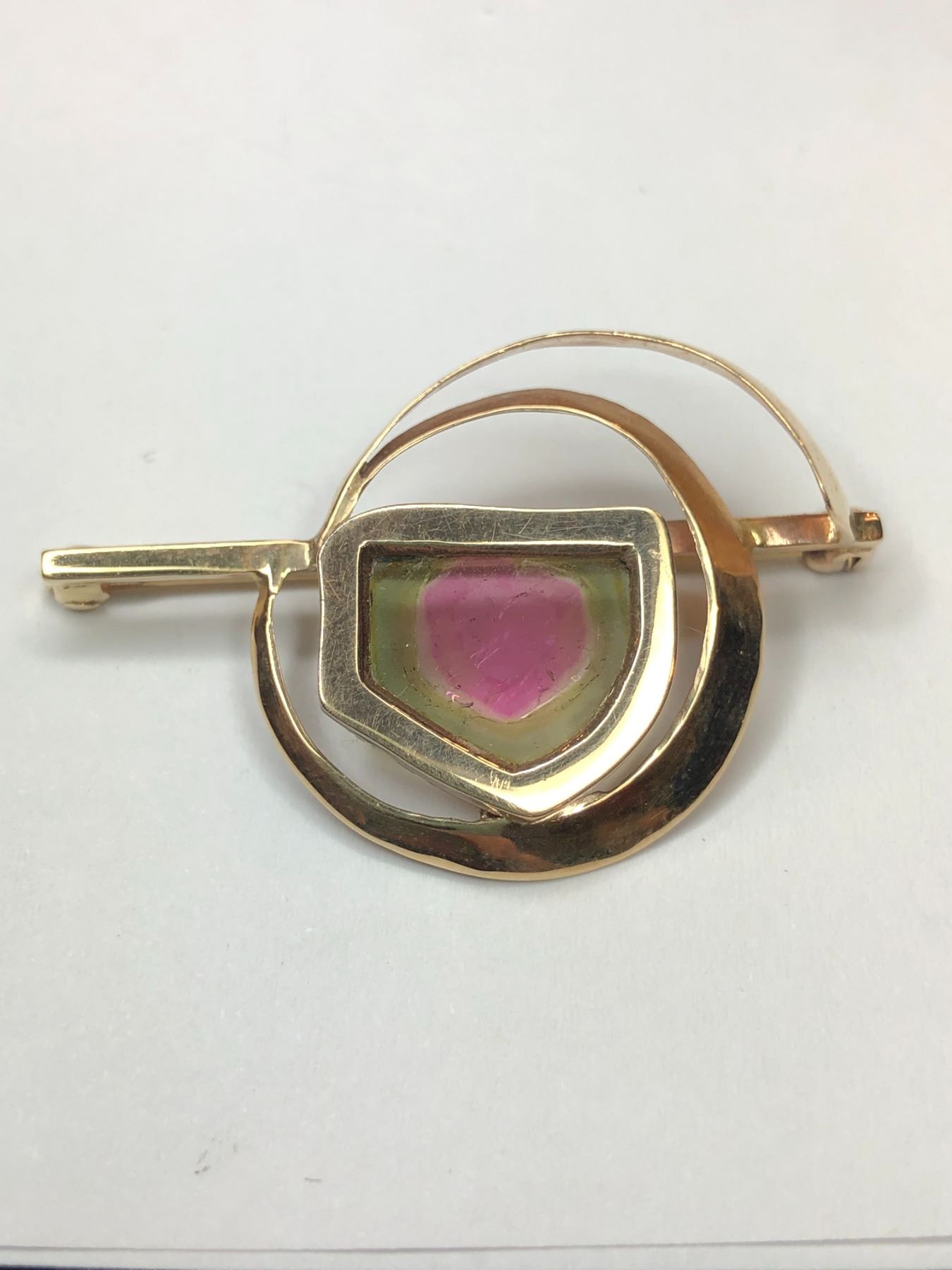 10K Yellow Gold Watermelon Tourmaline Brooch Weight: 5.2g 10K Yellow Gold Stone: Polished Watermelon Tourmaline