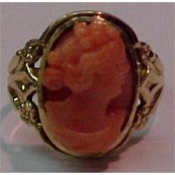 10K carved coral cameo ring, measures 3/4" in length, oval shaped carved coral cameo of woman's head in art nouveau style mounting