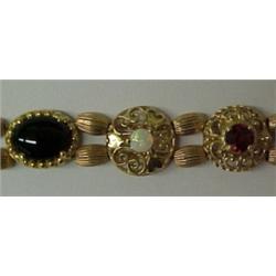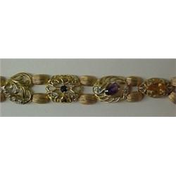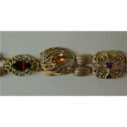 10K gold reproduction slide bracelet with ten slides, all 10K gold and set with semi- precious and precious stones, 7" long, one slide needs repair, Wt 6.1 dwt