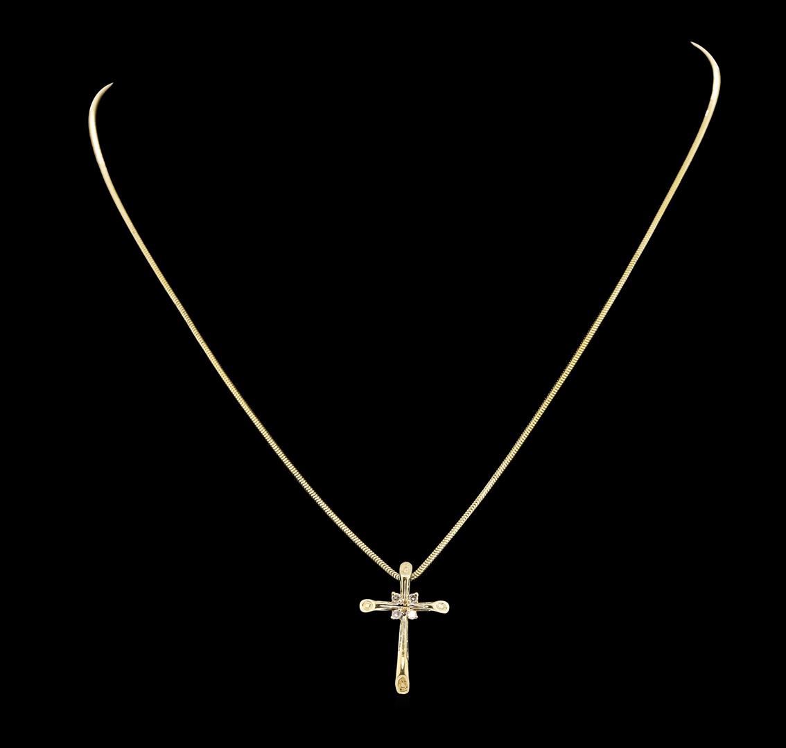 One lady's cross pendant and chain featuring: 10KT yellow gold cross attached to a 14KT rounded snake chain measuring sixteen inches in length weighing combined 6.1 grams containing diamonds weighing 0.10ctw.