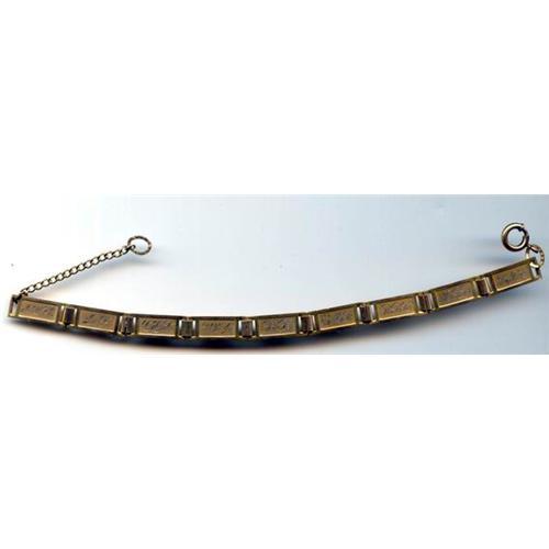 These sweetheart link bracelets have been around since the Victorian era. This one is 10KT Gold filled and probably dates to the 1940-50 era. The bracelet measures 8 1/4 inches long but the chain could be taken off to make this wearable on a smaller wrist. It has 9 links all with initials of friends or sweethearts. There is a plunger type clasp. The bracelet is in great condition and measures 1/4 inch wide. It is marked on the back, BOB-O-LINK, 1/20 10KT. Pat Applied