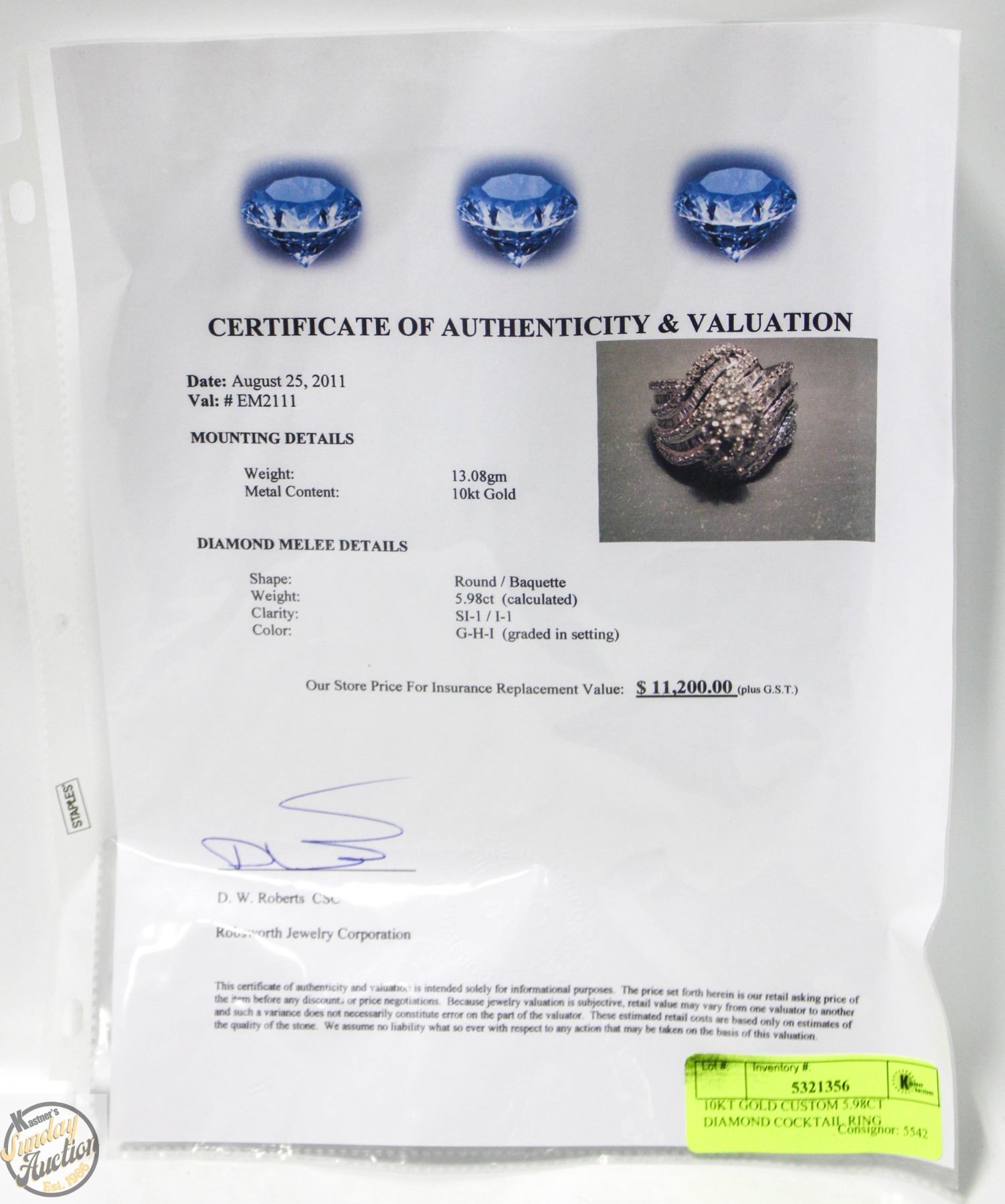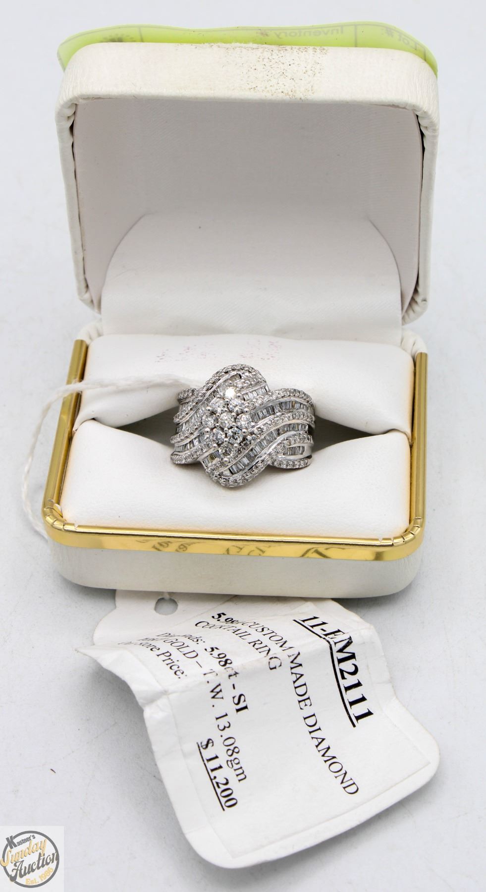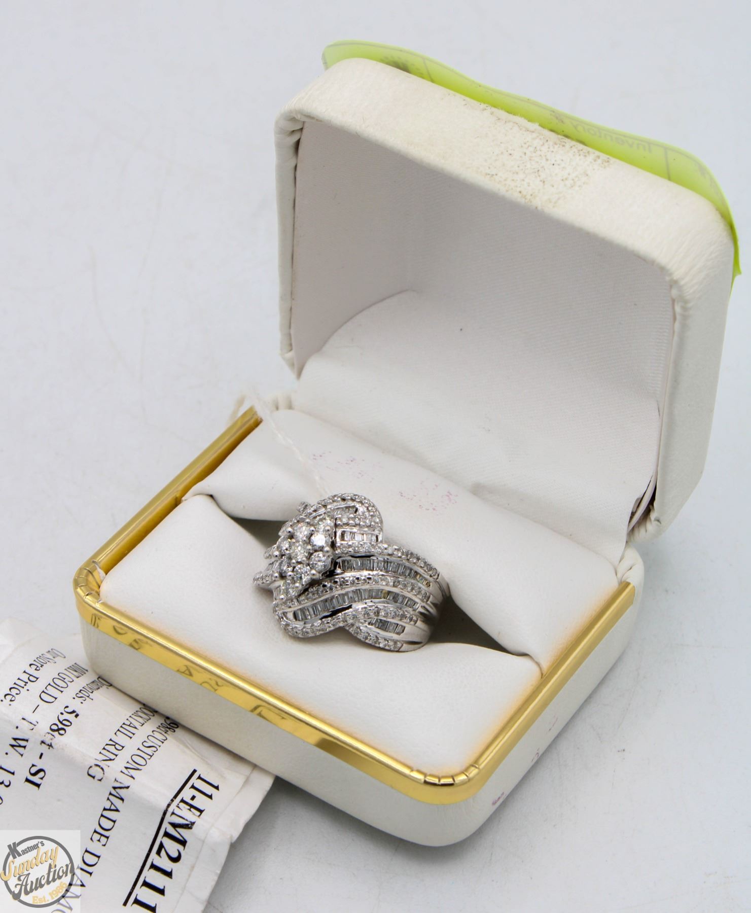 ROUND/BAGUETTE SHAPED DIAMONDS WITH AVERAGE CLARITY OF SI-1/I-1 AND AVERAGE COLOR G-H-I (GRADED IN SETTING), TOTAL WEIGHT 13.08GM, COMES WITH 2011 APPRAISAL FROM ROBSWORTH JEWLERY CORPORATION WITH INSURANCE REPLACEMENT VALUE $11,200.00, SIZE 8 **ALL ITEMS MUST BE REMOVED BY 5PM SATURDAY, MAY 17TH 2025. ALL REMAINING ITEMS WILL BE SUBJECT TO A $6.00 PER DAY STORAGE CHARGE. ANY ITEMS REMAINING AFTER MONDAY, JUNE 2ND 2025 WILL BE CONSIDERED FORFEITED. NO REFUNDS WILL BE ISSUED FOR FORFEITED ITEMS. TO SCHEDULE A PICK UP APPOINTMENT CLICK HERE
