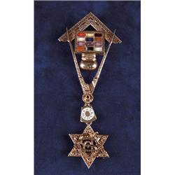 Lot 101 10KT MASONIC PIN A truly spectacular Masonic pin is 10kt yellow gold in the Masonic symbol and is brightly engraved. The pin is set with four rows of three colorful semi-precious stones and glass. Engraved on backside “Malden June 25, 1913 The RAC of the Tabernacle To PHP Philip S Deane”. Pin was made by H.W. Clark Boston. Pin comes in its original presentation case. SIZE: 5-1/2” l x 2-1/8” w. Weight is approx. 30dwt. CONDITION: Very good to excellent. 5-70822