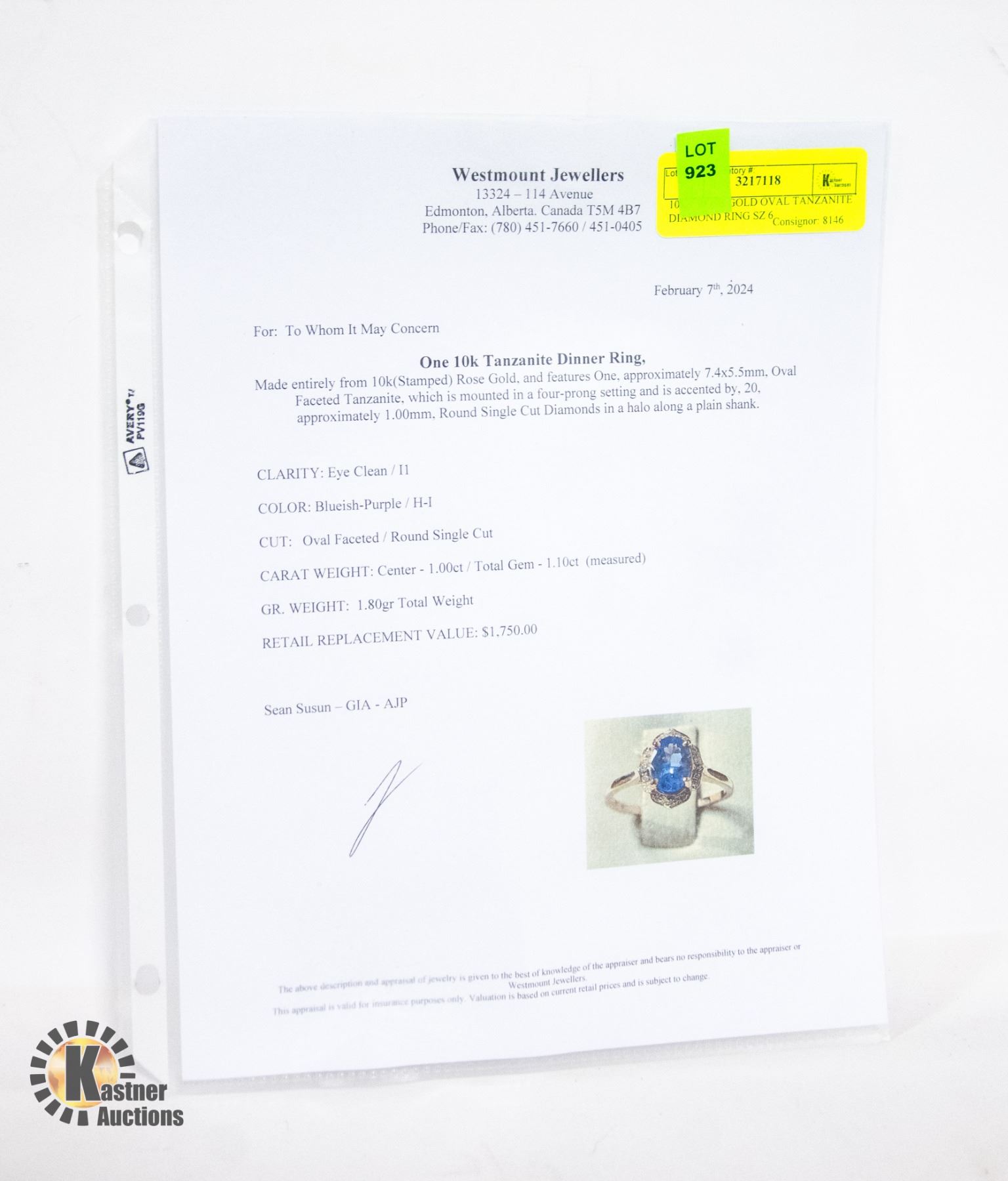 20 ROUND SINGLE CUT DIAMONDS SURROUNDING THE OVAL TANZANITE CENTER GEMSTONE. RETAIL REPLACEMENT VALUE $1,750.00 **ALL ITEMS MUST BE REMOVED BY 5PM SATURDAY, JUNE 8TH 2024. ALL REMAINING ITEMS WILL BE SUBJECT TO A $6.00 PER DAY STORAGE CHARGE. ANY ITEMS REMAINING AFTER MONDAY, JUNE 24TH 2024 WILL BE CONSIDERED FORFEITED. NO REFUNDS WILL BE ISSUED FOR FORFEITED ITEMS. TO SCHEDULE A PICK UP APPOINTMENT CLICK HERE
