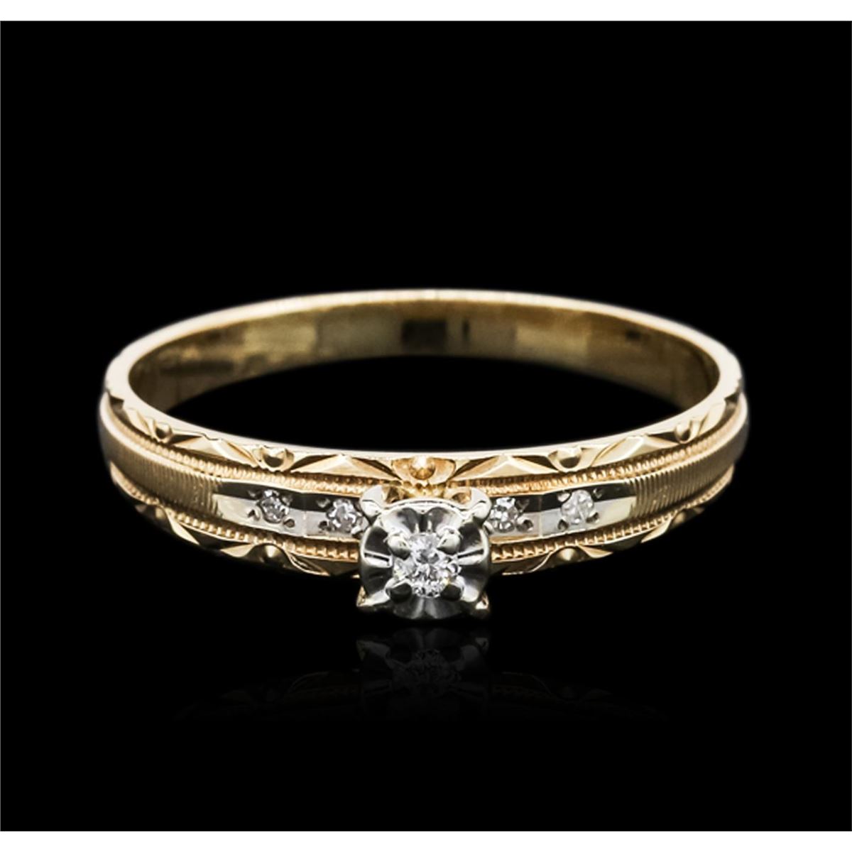 One ring featuring: 10KT yellow and white gold weighing 1.50 grams containing one round diamond center stone with a total weight of 0.01ct and round diamond side stones with a total weight of 0.02cts.