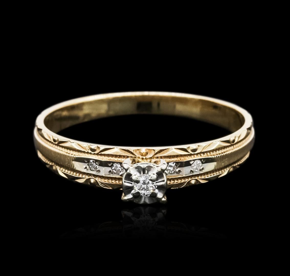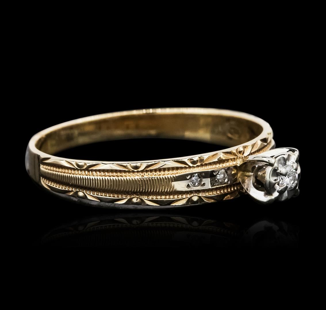 One ring featuring: 10KT yellow and white gold weighing 1.50 grams containing one round diamond center stone with a total weight of 0.01ct and round diamond side stones with a total weight of 0.02cts.