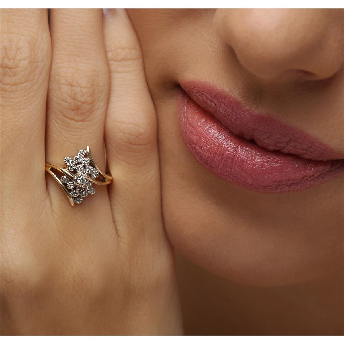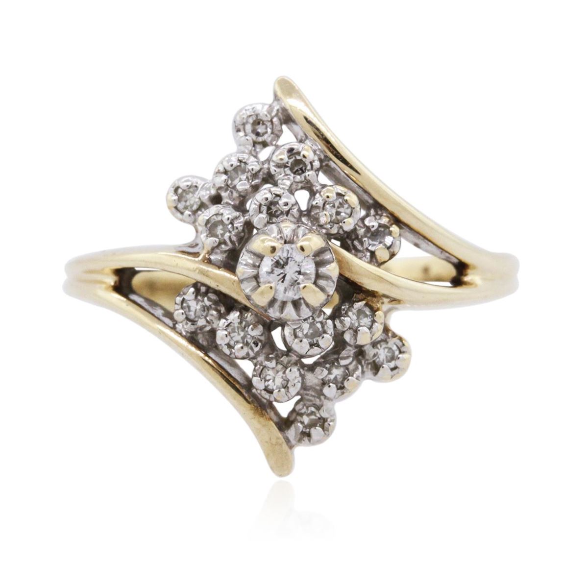 One ring featuring: 10KT two-tone gold weighing 3.00 grams containing one prong set round cut diamond center stone with a total weight of 0.03ct and round cut diamond side stones with a total weight of 0.05cts.