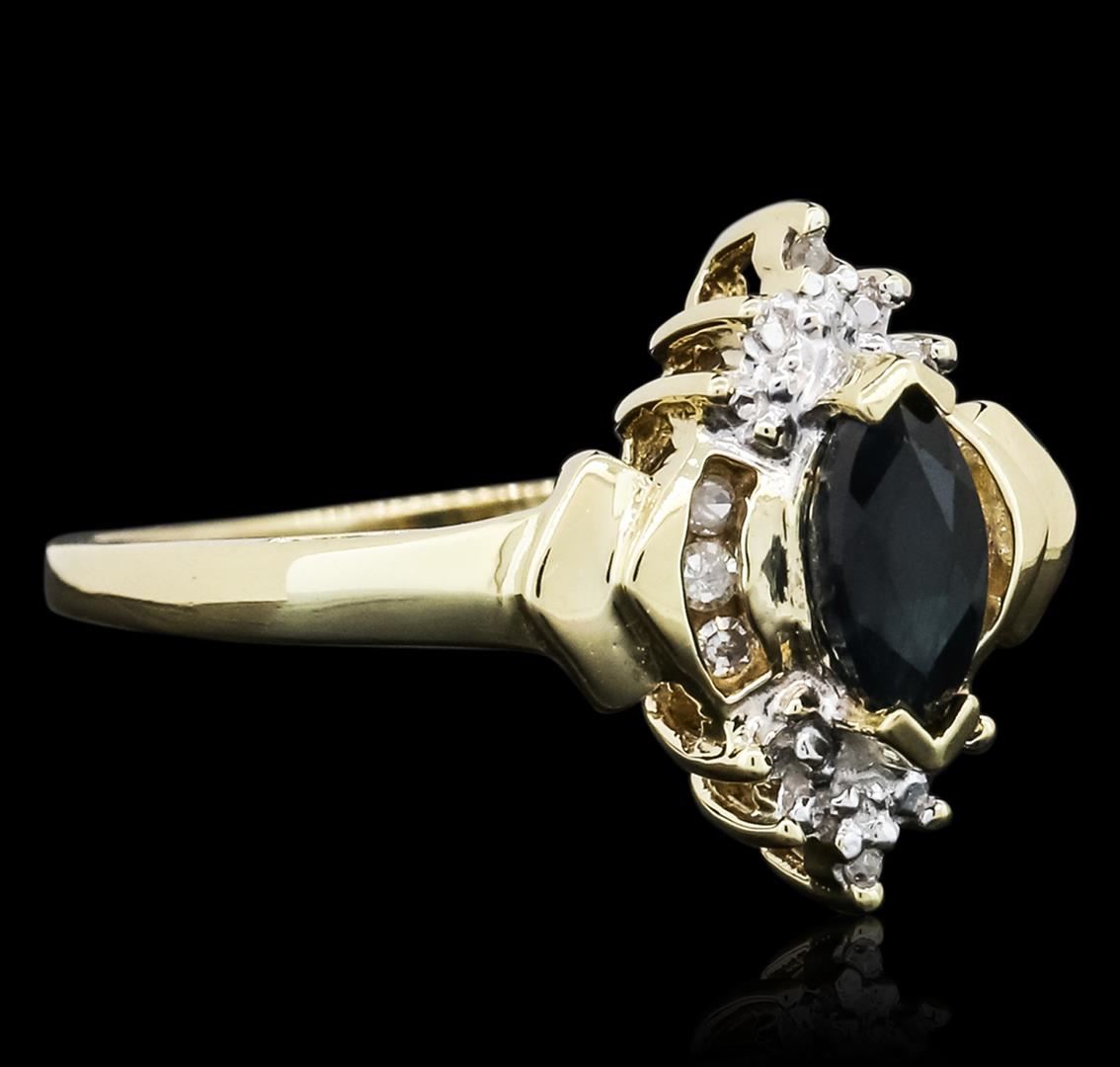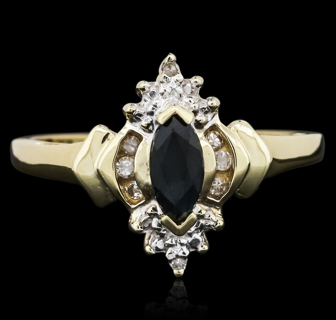 One ring featuring: 10KT yellow and white gold weighing 2.60 grams containing one sapphire center stone with a total weight of 0.35ct and round diamonds with a total weight of 0.05cts.