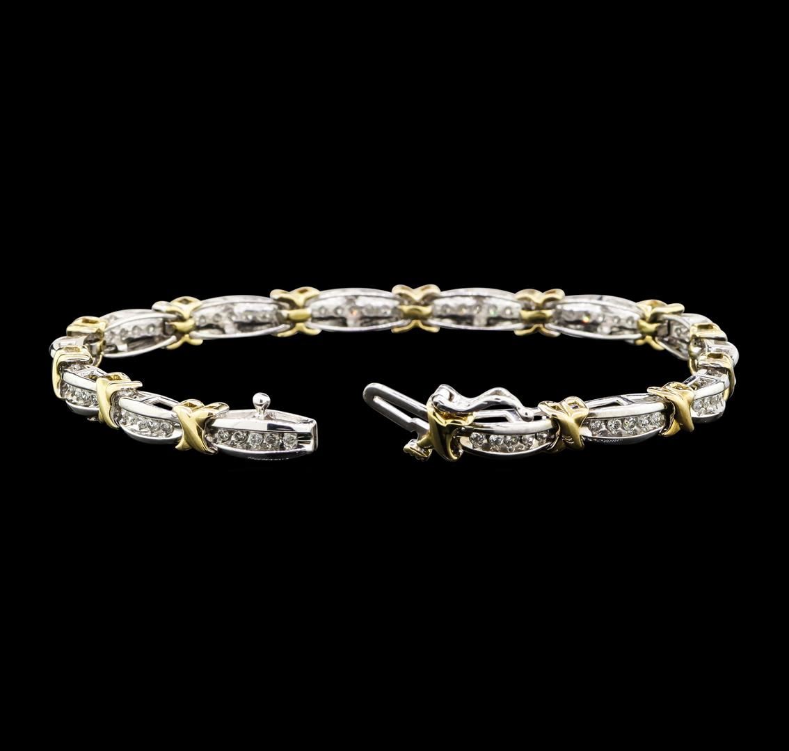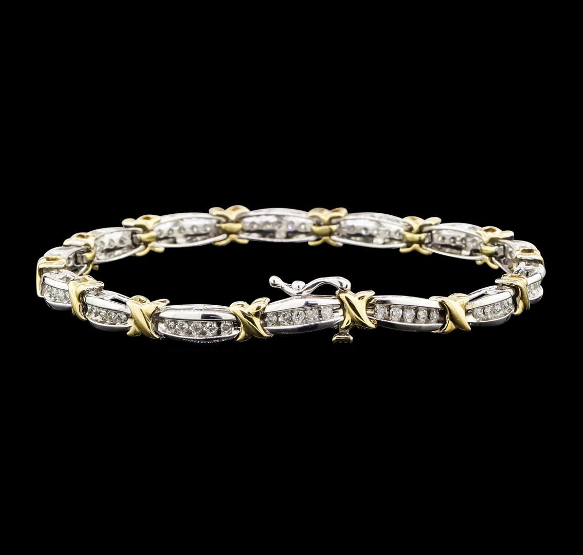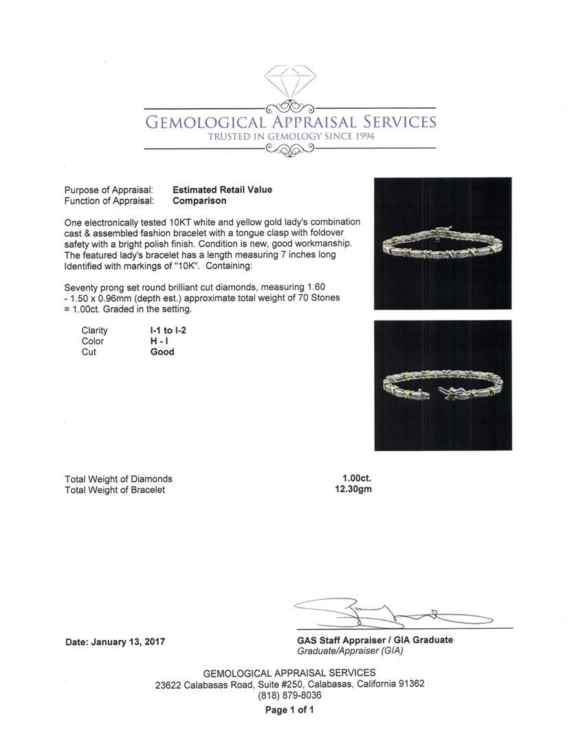 One electronically tested 10KT white and yellow gold lady's combination cast & assembled fashion bracelet with a tongue clasp with foldover safety with a bright polish finish. The featured lady's bracelet has a length measuring 7 inches long Identified with markings of "10K". Condition is new, good workmanship. Containing: Seventy prong set round brilliant cut diamonds, measuring 1.60 - 1.50 x 0.96mm (depth est.) approximate total weight of 70 Stones = 1.00ct. Graded in the setting. Clarity: I-1 to I-2. Color: H - ICut Good. Total Weight of Diamonds 1.00ct. Total Weight of Bracelet 12.30gm. GAS Appraised.