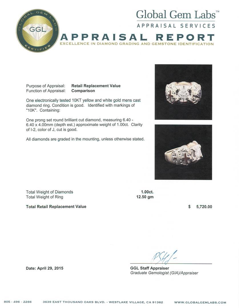 One electronically tested 10KT yellow and white gold mens cast diamond ring. Identified with markings of "10K". Condition is good. Containing: One prong set round brilliant cut diamond, measuring 6.40 - 6.40 x 4.00mm (depth est.) approximate weight of 1.00ct. Clarity: I-2. Color: J, Cut is Good. All diamonds are graded in the mounting, unless otherwise stated. Total Weight of Diamonds 1.00ct. Total Weight of Ring 12.50 grams. GGL Appraised at $5,720.00.