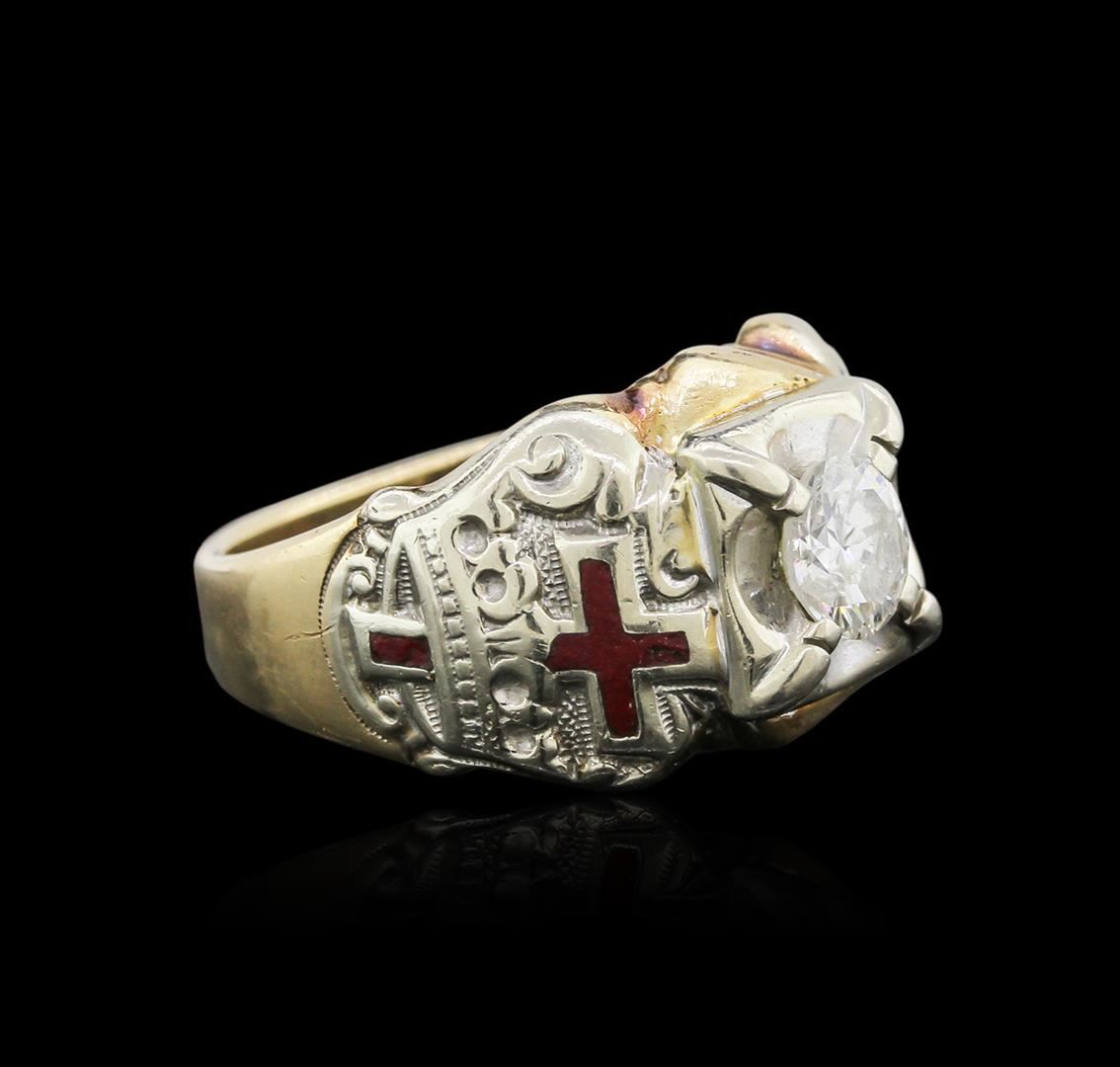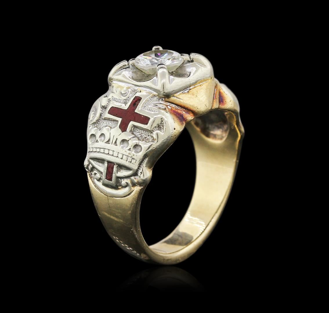 One electronically tested 10KT yellow and white gold mens cast diamond ring. Identified with markings of "10K". Condition is good. Containing: One prong set round brilliant cut diamond, measuring 6.40 - 6.40 x 4.00mm (depth est.) approximate weight of 1.00ct. Clarity: I-2. Color: J, Cut is Good. All diamonds are graded in the mounting, unless otherwise stated. Total Weight of Diamonds 1.00ct. Total Weight of Ring 12.50 grams. GGL Appraised at $5,720.00.