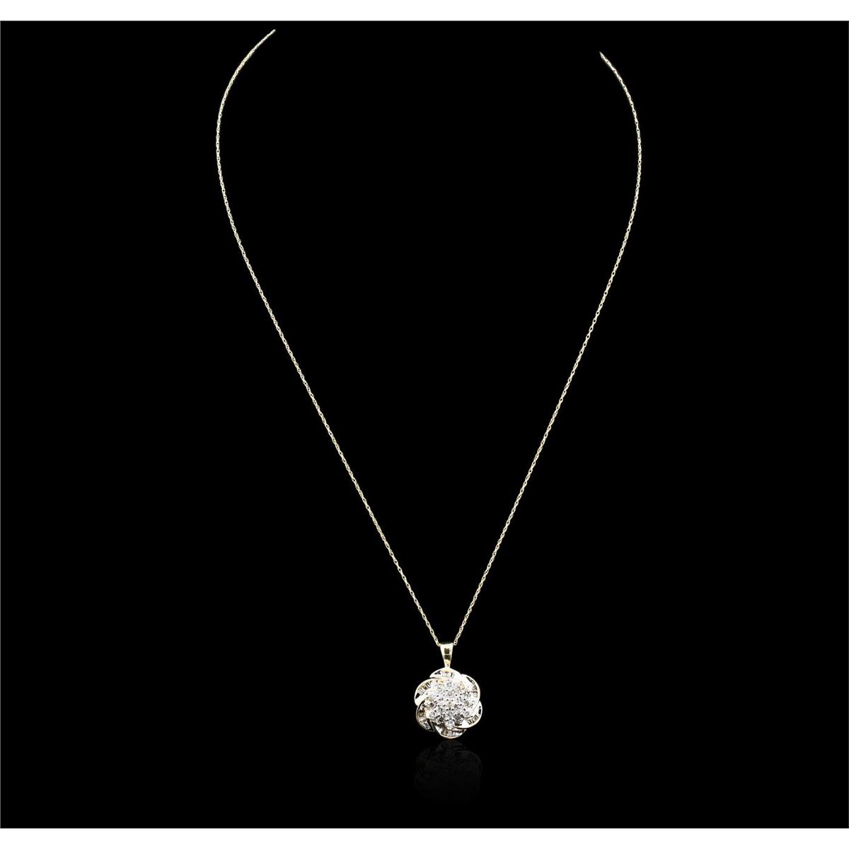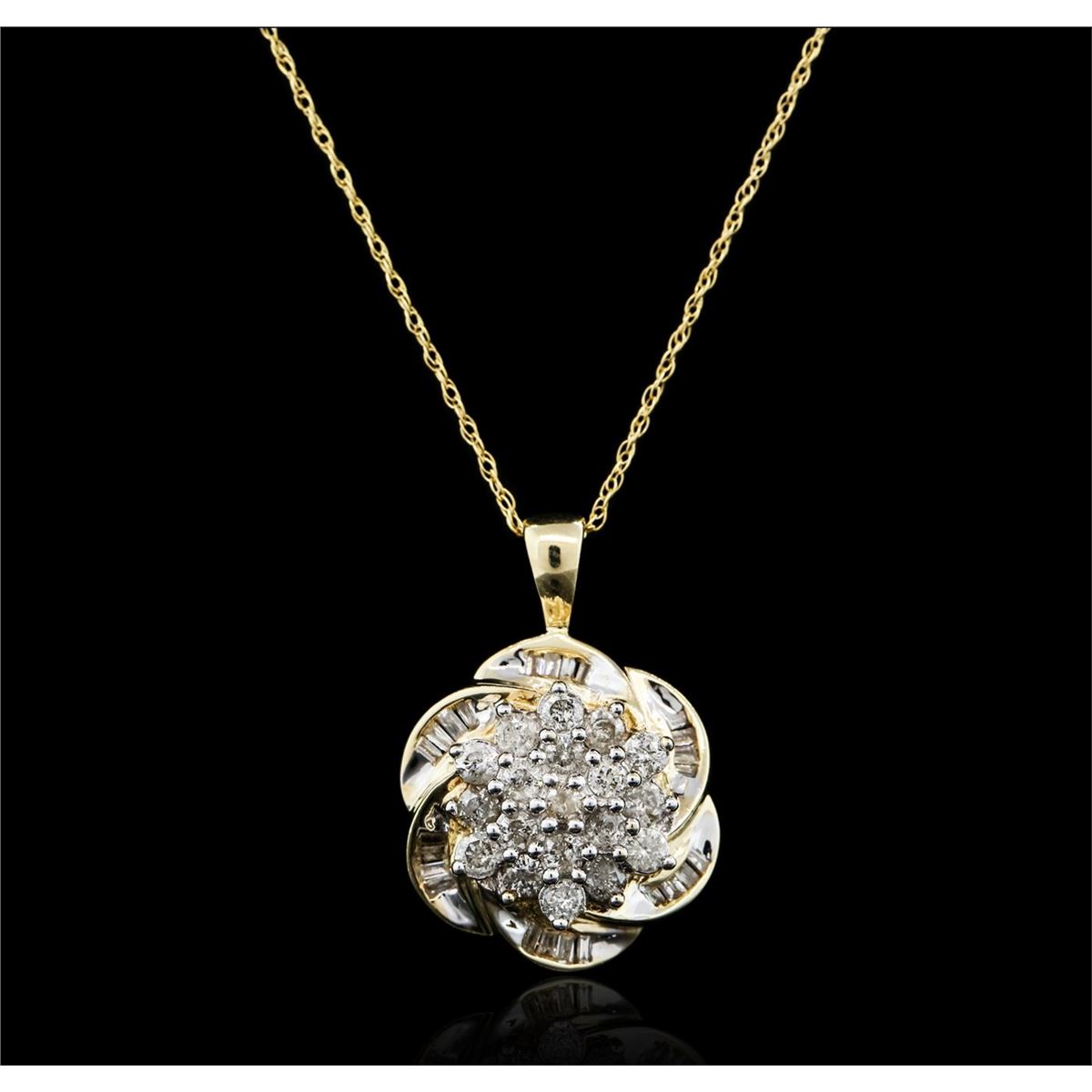 One pendant with chain featuring: 10KT two-tone gold weighing 3.40 grams containing prong set round cut/channel set baguette cut diamonds with a total weight of 1.00cts.