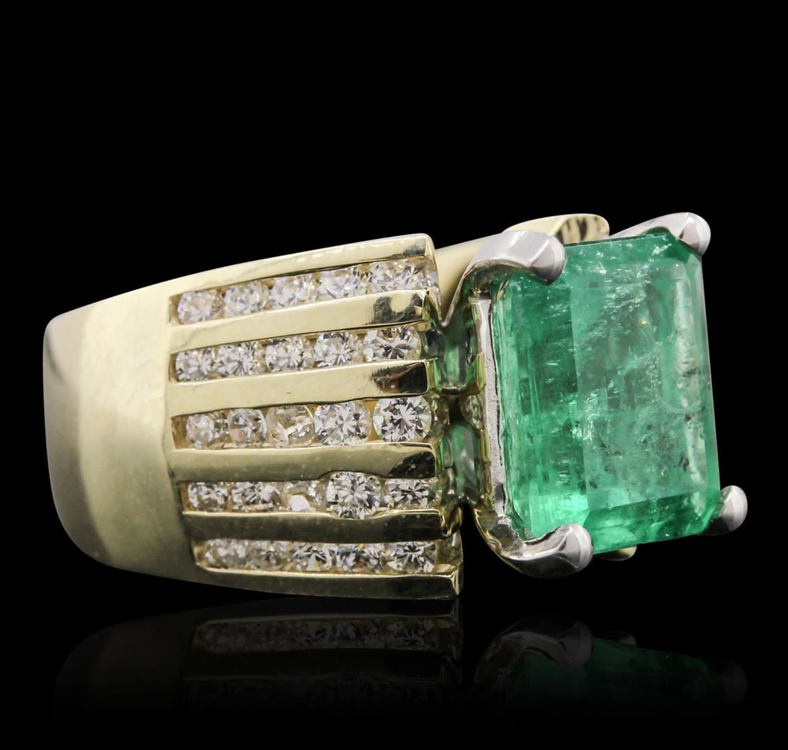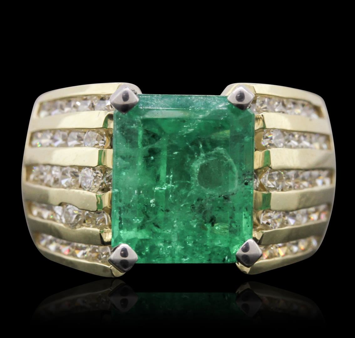 One electronically tested 10KT two-tone, white & yellow gold ladies cast & assembled emerald and diamond ring with a bright polish finish. Condition is good. The featured emerald is supported by diamond set shoulders and completed by a six and one-half millimeter wide band. Identified with markings of "10K". Containing: One prong set rectangular step cut natural emerald, measuring 10.50 x 8.80 x 5.72mm, approximate weight of 4.31ct., clarity is heavily included, type III, medium dark, moderately strong, very slightly bluish green color, (GIA vslbG 6/4), cut is good. Transmitting light with a minimum of distortion, transparent to translucent. Naturally occurring internal & external characteristics are present. Indications of oil residue. Graded in the setting. Sixty channel set round brilliant cut diamonds, measuring 2.00 - 1.70 x 1.11mm (depth est.) approximate. Total Weight of 60 Stones = 1.48ct. Graded in the setting. Clarity VVS2 to VS2; Average. Color: G - I. Total Weight of Colored Stones 4.31ct. Total Weight of Diamonds 1.48ct. Total Weight of Ring 10.30 grams. AIG Appraised at $16,470.00.